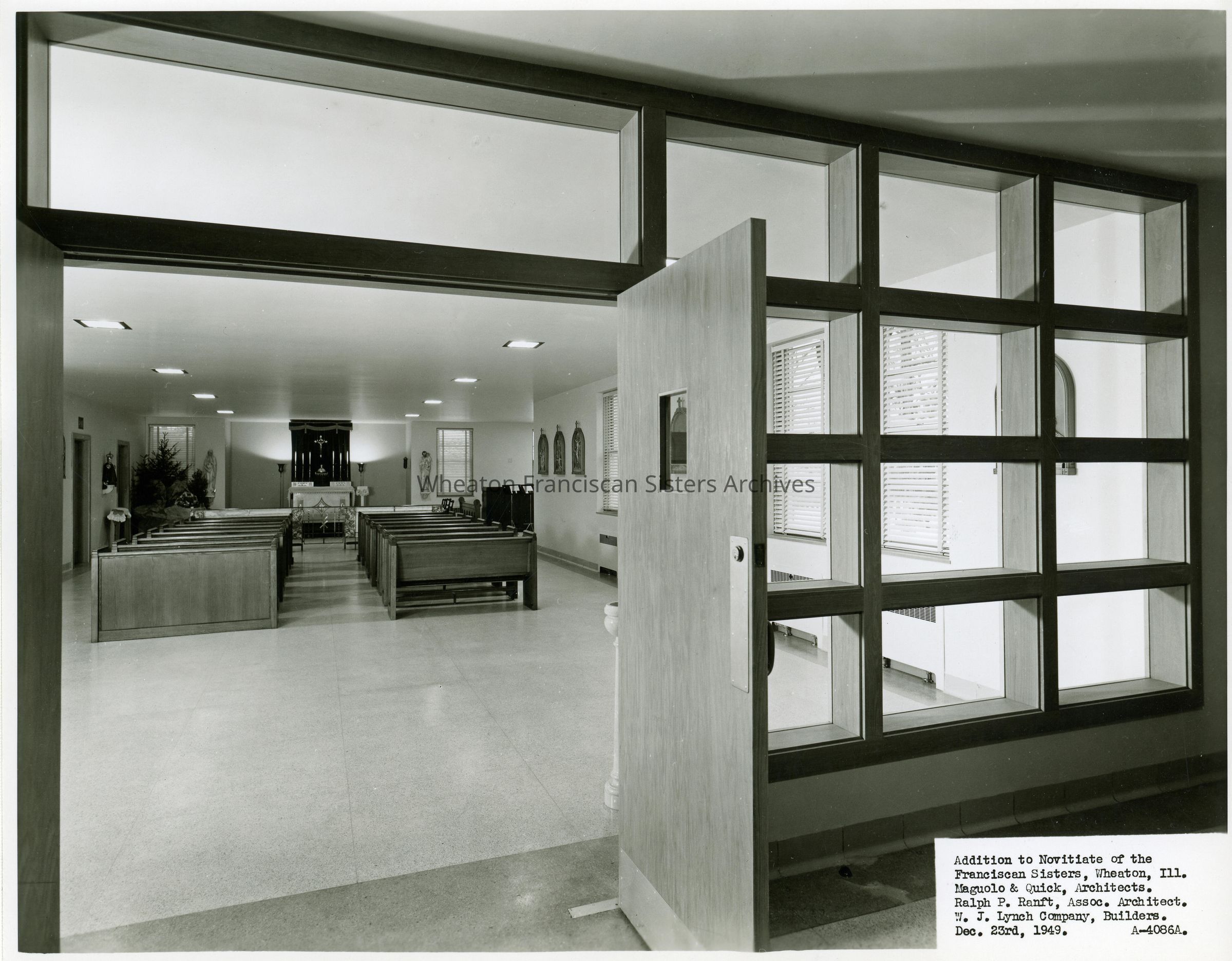 The completed addition to the Novitiate, also known as Kara Hall, in Wheaton, Illinois. This image features the interior of the chapel. The original home (not pictured) was built in 1902 and was first known as the Hurley House. Designed by architect Jarvis Hunt, it was the personal residence of Edward N. Hurley Sr. The photo lists Maguolo & Quick as architects, Ralph P. Ranft as associate architects and the W.J. Lynch Company as builders.