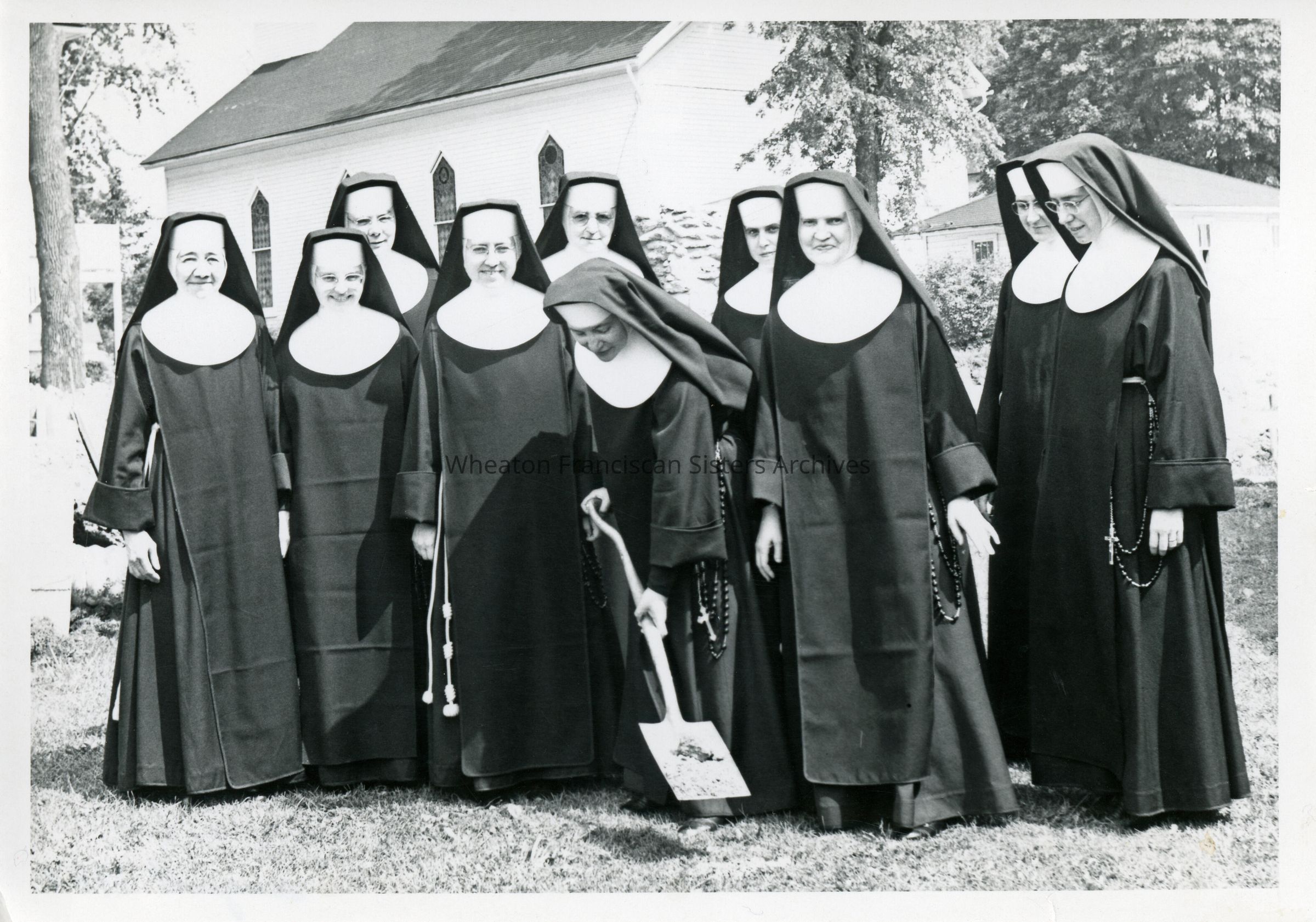Transfiguration School groundbreaking ceremony celebrating the construction of four new classrooms. Sisters in the front row, from left to right, are Sister Mary (Davidica/Mary Cecelia) Langfield, Sister Phyllis (Yvonne) Wiza, Sister Anna (Elaine) Georger, Sister Pauline (Mary Joseph) Langfield, Sister Linda (Herlinda) McCarty and Sister Dorothy (Francella) Birk. Sisters in the back row, from left to right, are Sister Joan (Victor) Warburton, Sister Mary (Bartholomew) Spelman, Sister Colette (Ruth) Woltering and Sister Elizabeth (Marina/Beth) Cosgrove. The original Transfiguration Church, located at 217 South Church Street, is visible in the background.