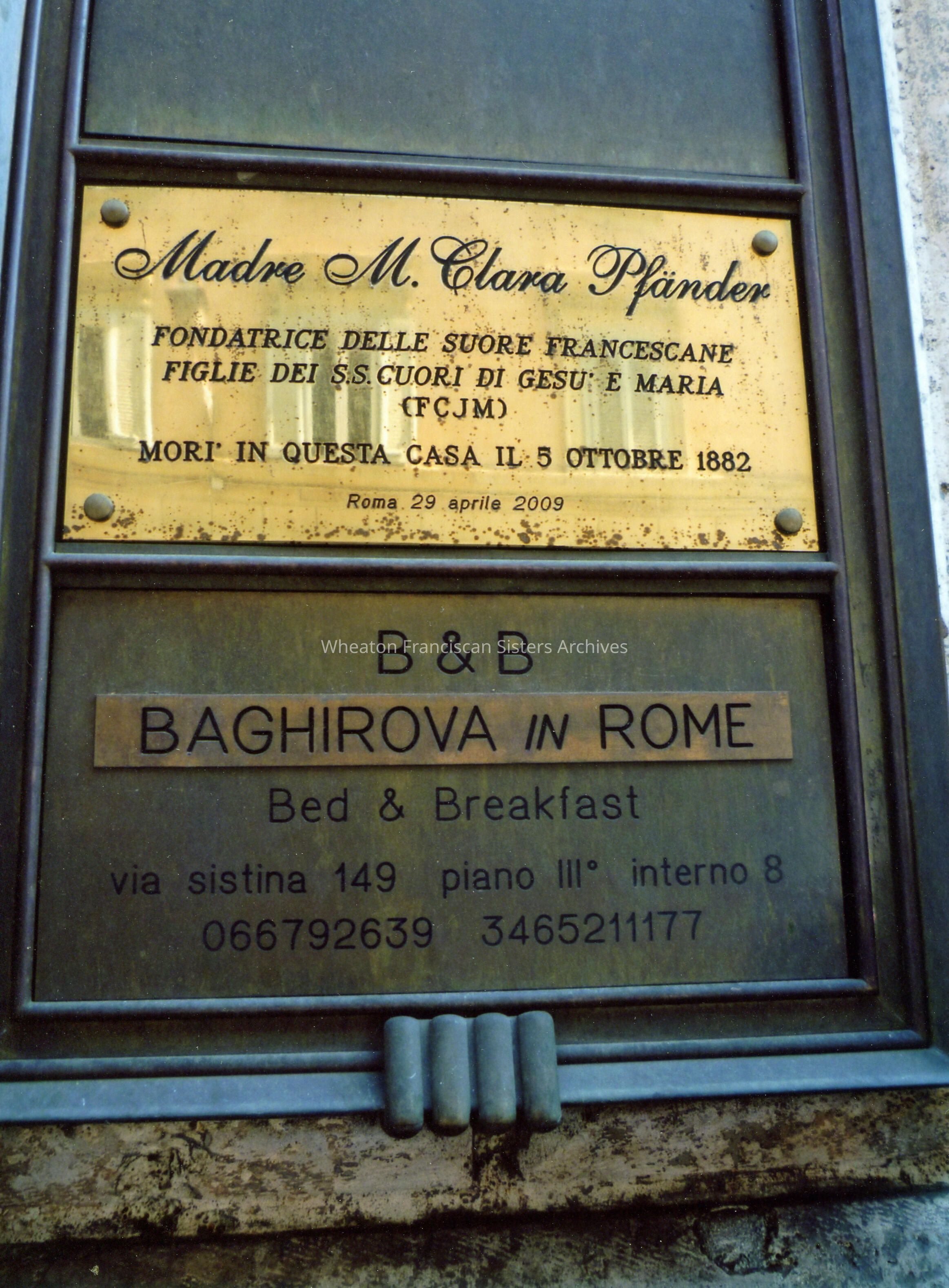 Memorial plaque near the entrance of 149 Via Sistina in Rome, Italy. Mother Clara Pfaender arrived in Rome in February of 1881 and this location was her final residence. She passed away here on October 5th, 1882. An inscription on the building, not visible in this photo, reads "When in short time we leave this house / that others' hands have built for us, / we shall enter an everlasting house / that we have built with our own hands."