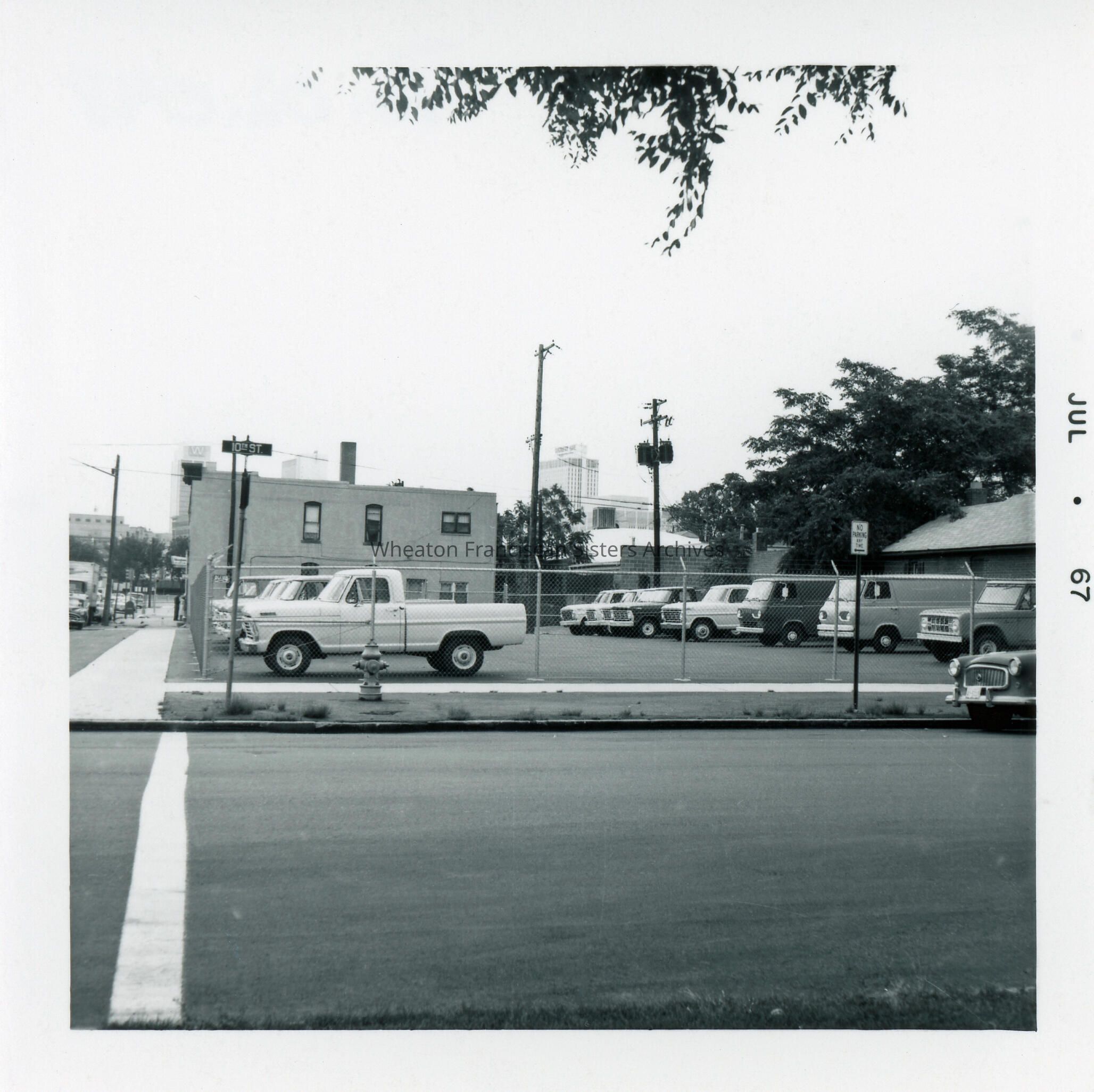 Property near the St. Rose Residence located at 952 10th Street in Denver, Colorado. A home for young working women, this image was taken around the time of its closure and features neighboring buildings. At different times, this location was known as St. Clara's Convent, St. Rose's Convent, St. Rosa's Home and was once the site of St. Clara's Orphanage. Downtown Denver is visible in the distance.