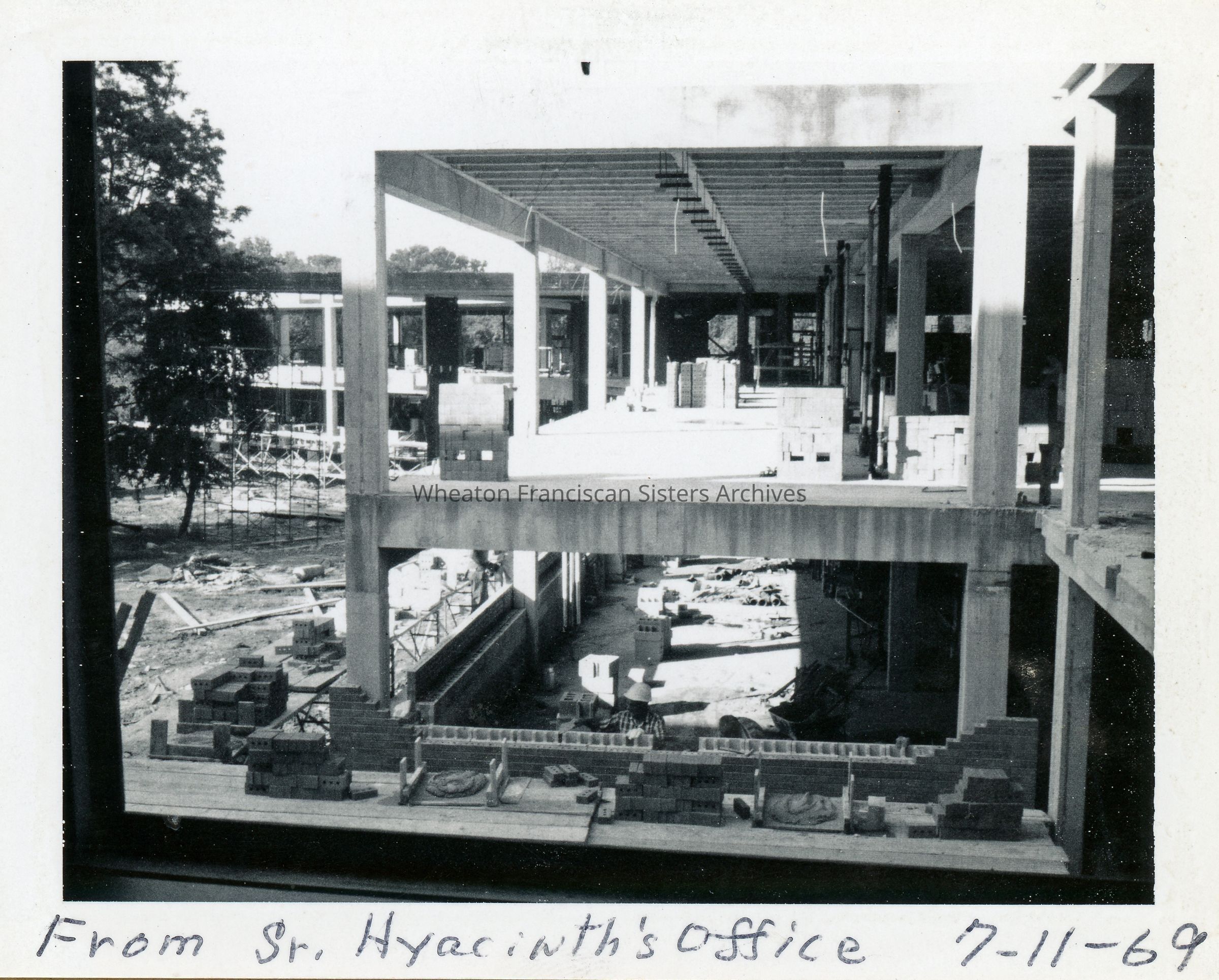 Construction of Marianjoy Rehabilitation Hospital in Wheaton, Illinois. The caption at the bottom states "From Sister Hyacinth's Office".