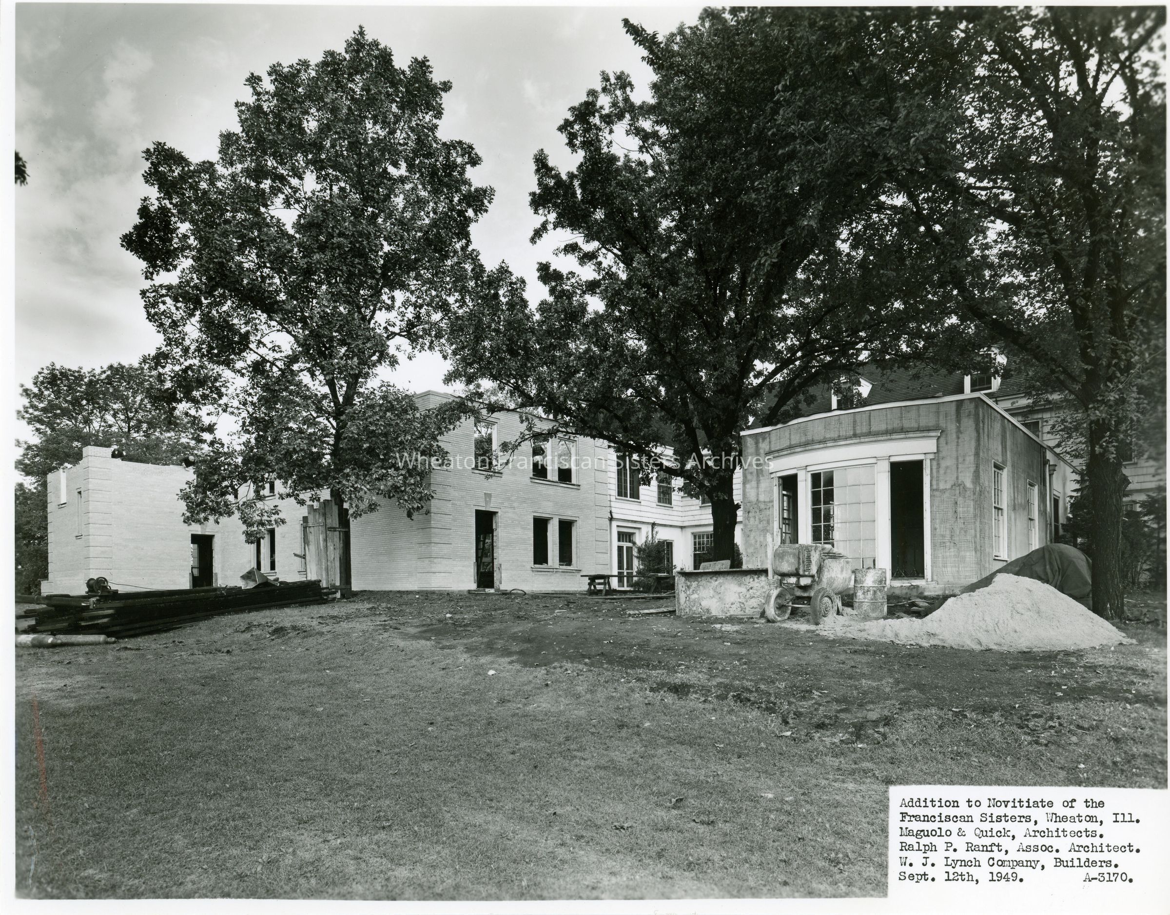 Nearing completion, an addition to the Novitiate, also known as Kara Hall, is pictured in Wheaton, Illinois. Visible in the background on the right, the original home was constructed in 1902 and was first known as the Hurley House. Designed by architect Jarvis Hunt, it was the personal residence of Edward N. Hurley Sr. The photo lists Maguolo & Quick as architects, Ralph P. Ranft as associate architects and the W.J. Lynch Company as builders.