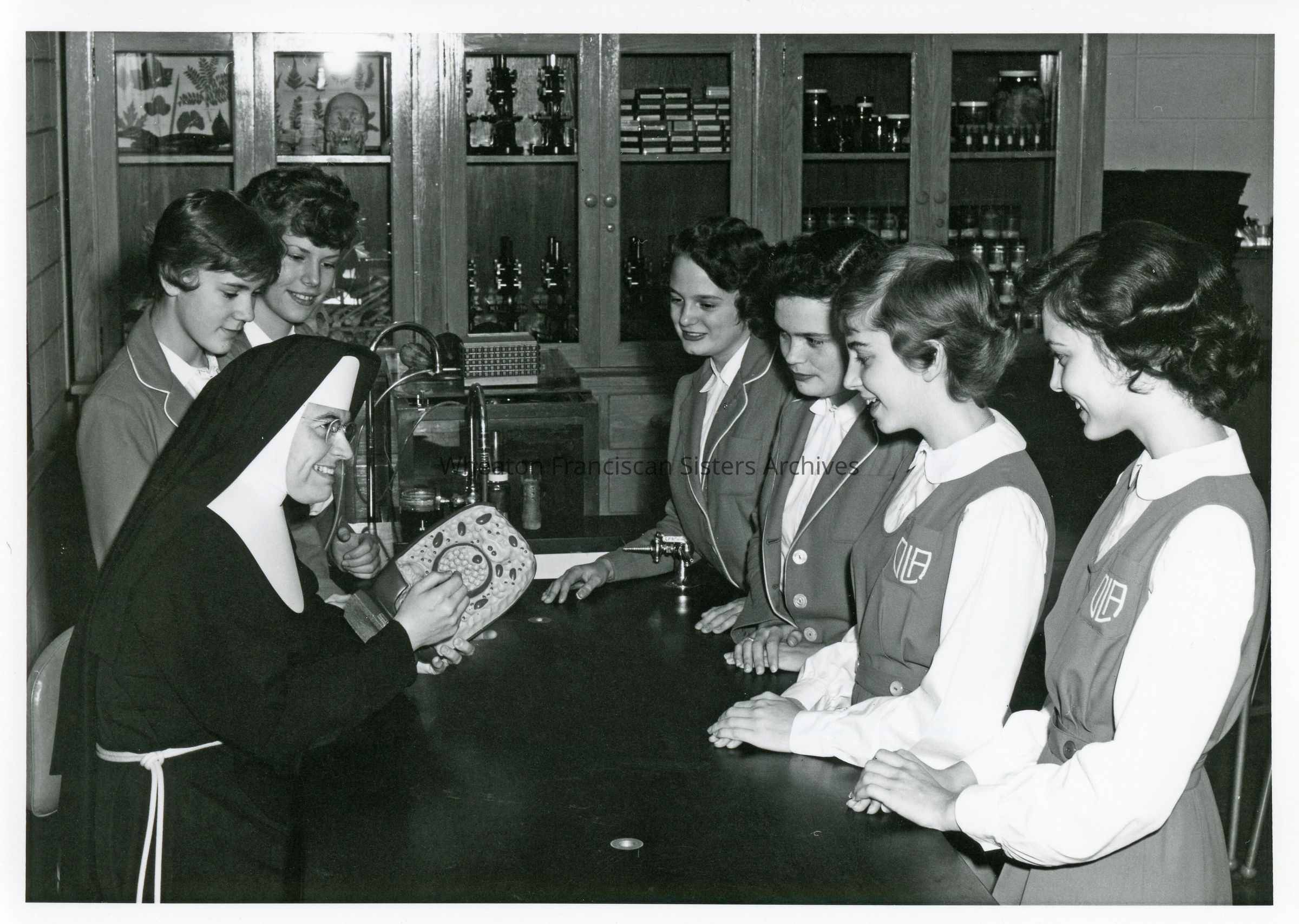 St. Francis High School located at 2130 West Roosevelt Road in Wheaton, Illinois. This image features Sister Florence (Jude) Roling in biology class with Postulants and students.