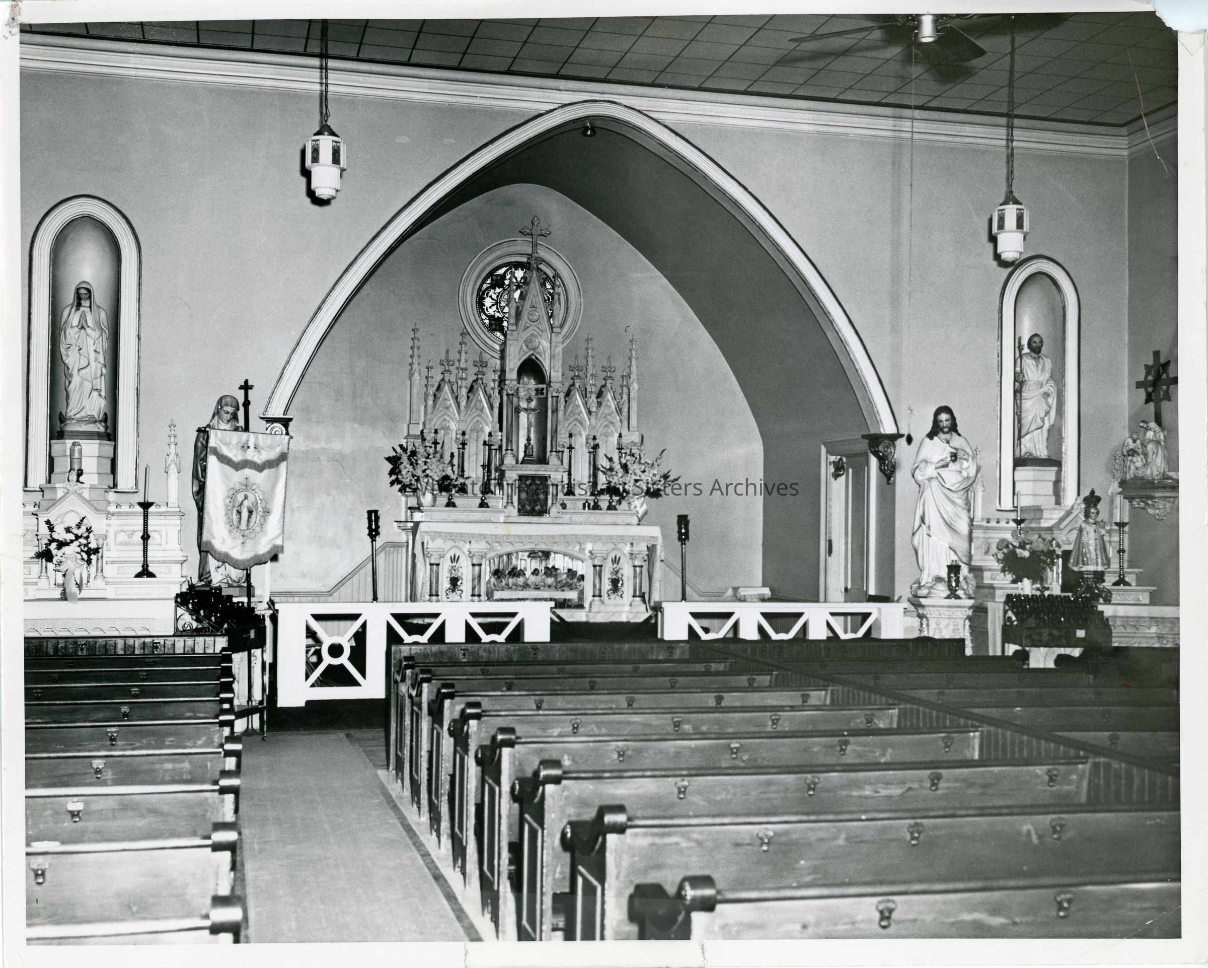 Transfiguration Church located at 217 South Church Street in Wauconda, Illinois. This image features the altar and pews. Built around 1875, the white frame building later served as a meeting hall.