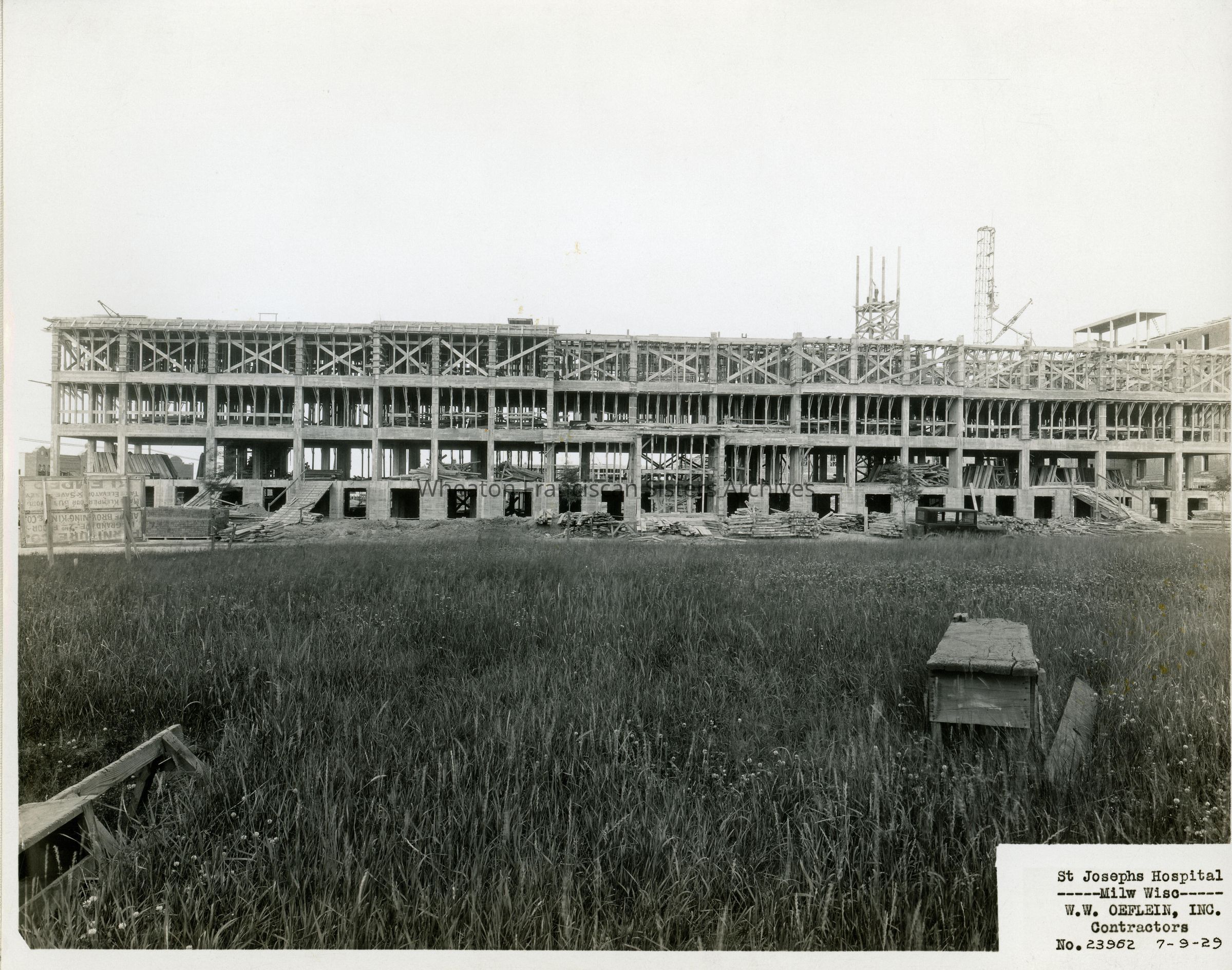 Construction of St. Joseph's Hospital located at 5000 West Chambers Street in Milwaukee, Wisconsin. The contractor is listed as W. W. Oeflein Inc.