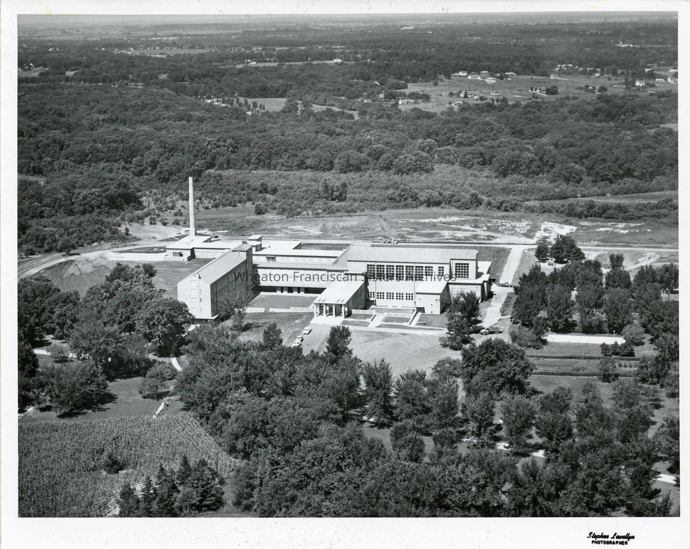 Aerial photo of the Our Lady of Angels Motherhouse and Novitiate at 26W171 Roosevelt Road in Wheaton, Illinois. Looking west, the main entrance, later known as entrance seven, is situated near the center. The swimming pool is on the far right.