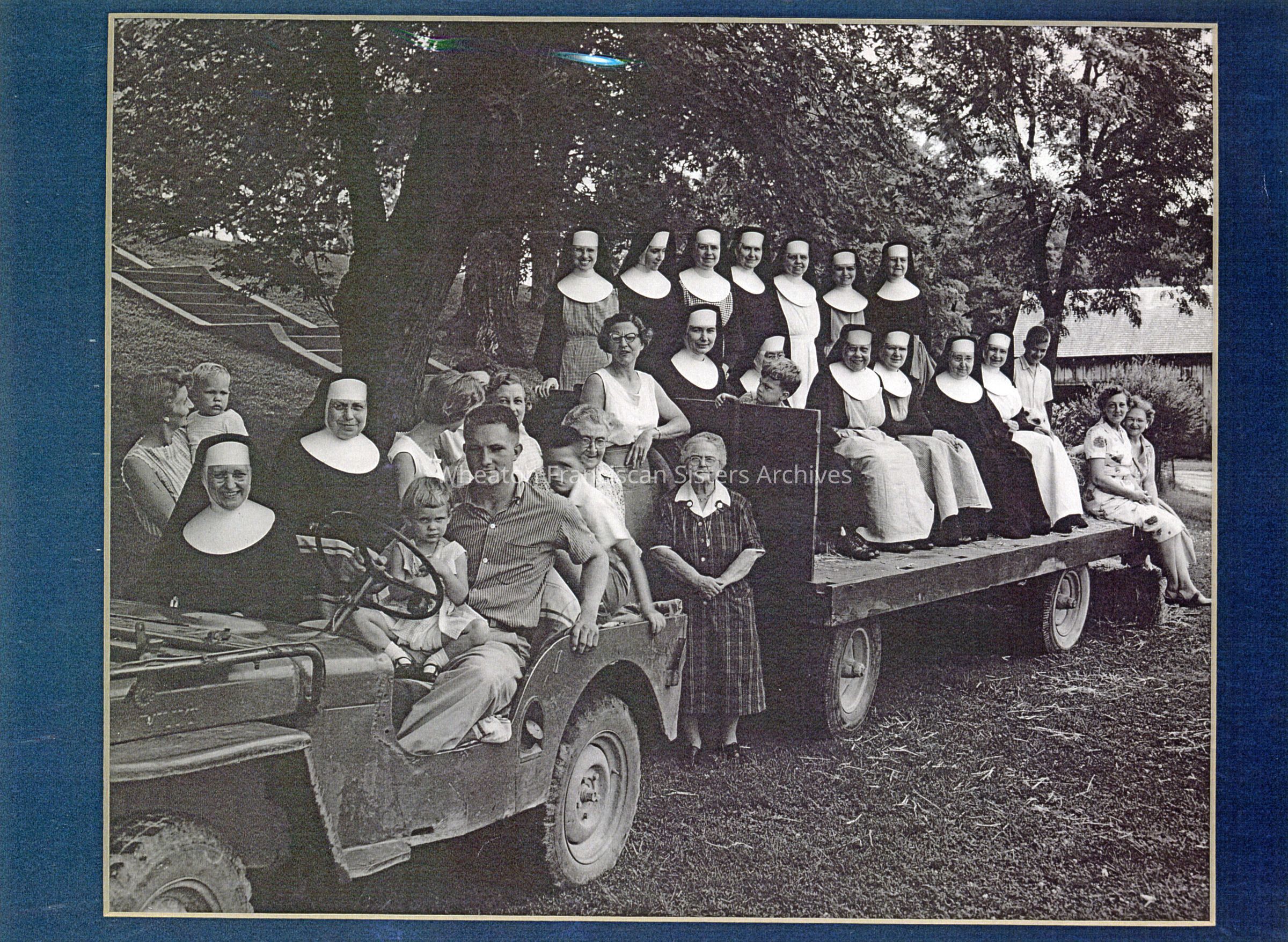 Gathering at the Fuerth home located in Cape Girardeau, Missouri. Present in row one are: Sister Gertrude (Virgilia) Beikler, Ann Schneider Hamilton, Charles Fuerth, Bill Evans, Edna Earle Thomas, Rachel Kern, unknown, Sister Mary (Flora) Diebold, Sister Ethel (Helene) Van Domelen, Sister Johanna (Angelica) Hodge, Sister Maria (Donata) Harney, J. Michael Fuerth, Lucille Campbell and Clara Knaup. Present in row two are: Loretta Fuerth Schneider, John Arthur Schneider, Sister Maria (Jona) Bathe, Margaret Fuerth Kruse, Corona Fuerth, Vernice Baumstark, Sister Kathryn (Claudia) Glasser and Sister Agnita. Present in row three are: Sister Margaret (Audrey) DeHaus, Sister Adeline (Domitilla) Young, Sister Reginia (Clarissa) Orf, Sister Marcellina (Cortona) Seyer, Sister Rosa (Valeria) Aubertin, Sister Alma (Giles) Teder and Sister Agnes (Priscilla) Robers.