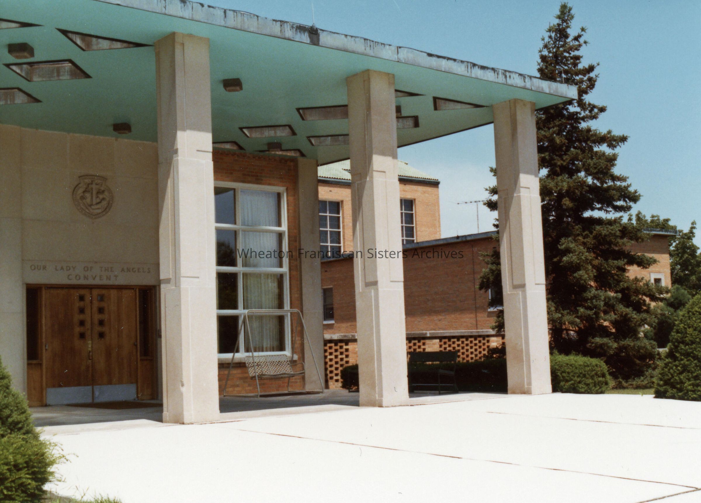 The Our Lady of Angels Motherhouse at 26W171 Roosevelt Road in Wheaton, Illinois. Looking north, the main entrance, later known as entrance seven, is pictured. The chapel and grotto are visible on the right.