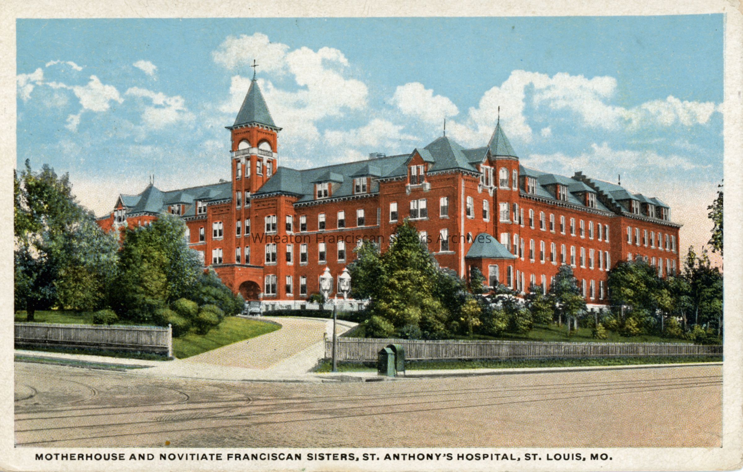 Postcard featuring St. Anthony’s Hospital, Novitiate and Motherhouse located at 3520 Chippewa Street in St. Louis, Missouri. The back contains a personal message from Sister Mary (Davidica/Mary Cecelia) Langfield to E. H. Langfield in Buffalo, New York.