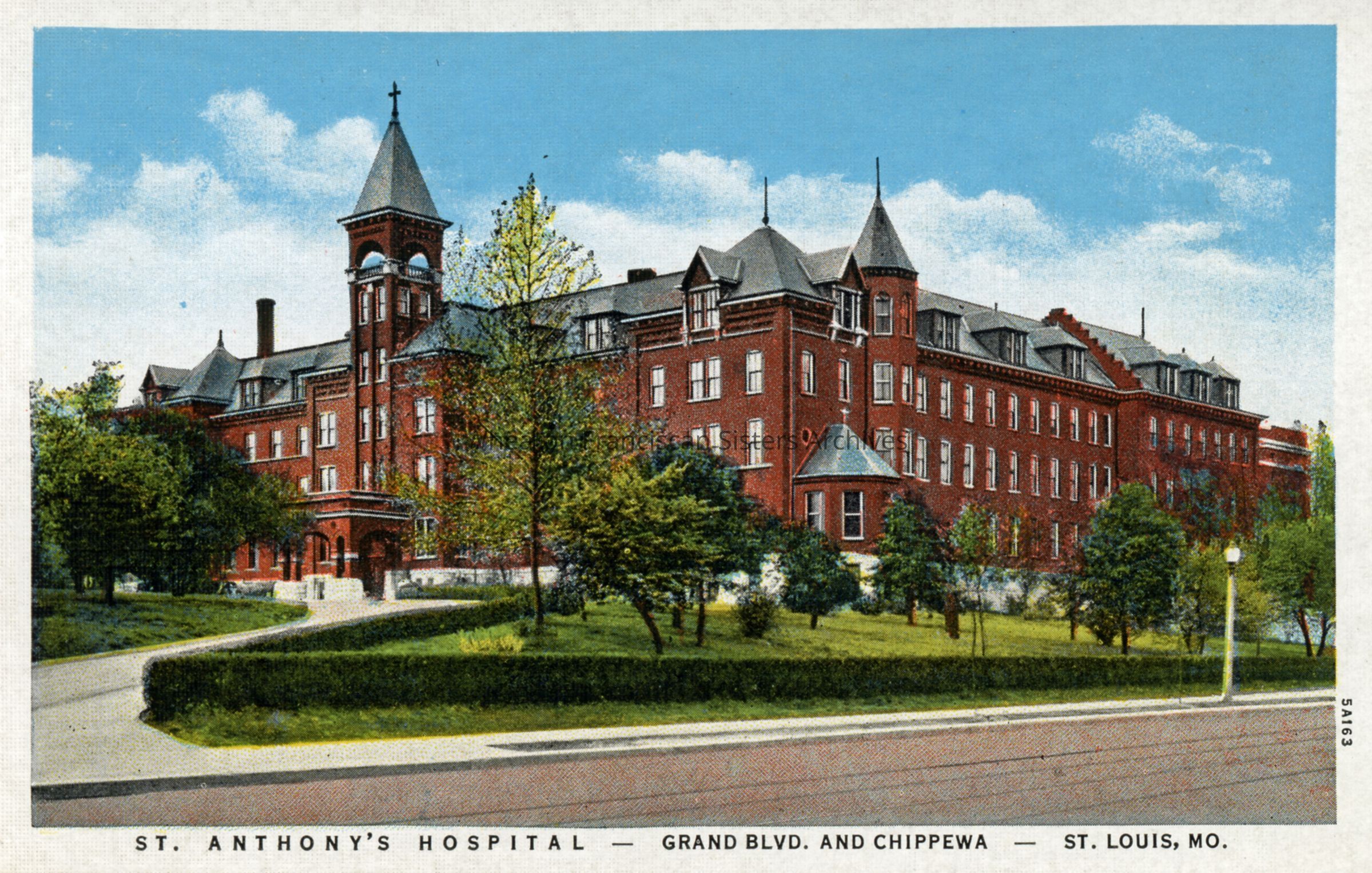 Postcard featuring St. Anthony’s Hospital, Novitiate and Motherhouse located at 3520 Chippewa Street in St. Louis, Missouri.