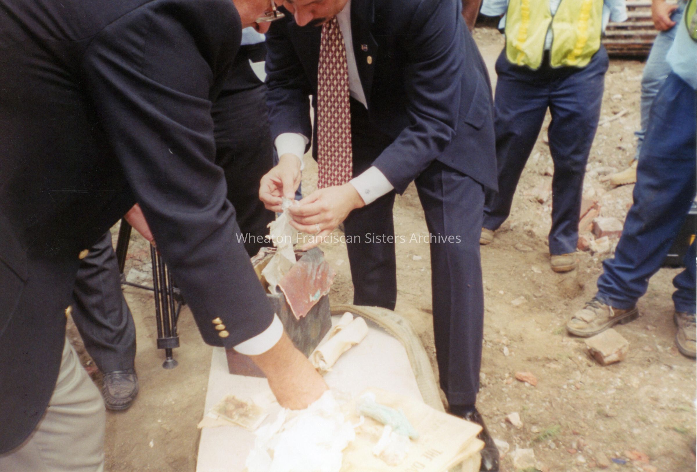 Demolition of St. Francis Hospital located at 825 Good Hope Street in Cape Girardeau, Missouri. This image was taken during the removal of the cornerstone time capsule. Opened in 1914, the hospital replaced an older structure located at Sprigg and Williams Streets. St. Francis remained here until 1976 and the building was demolished in 2000. Affordable housing now occupies the site.