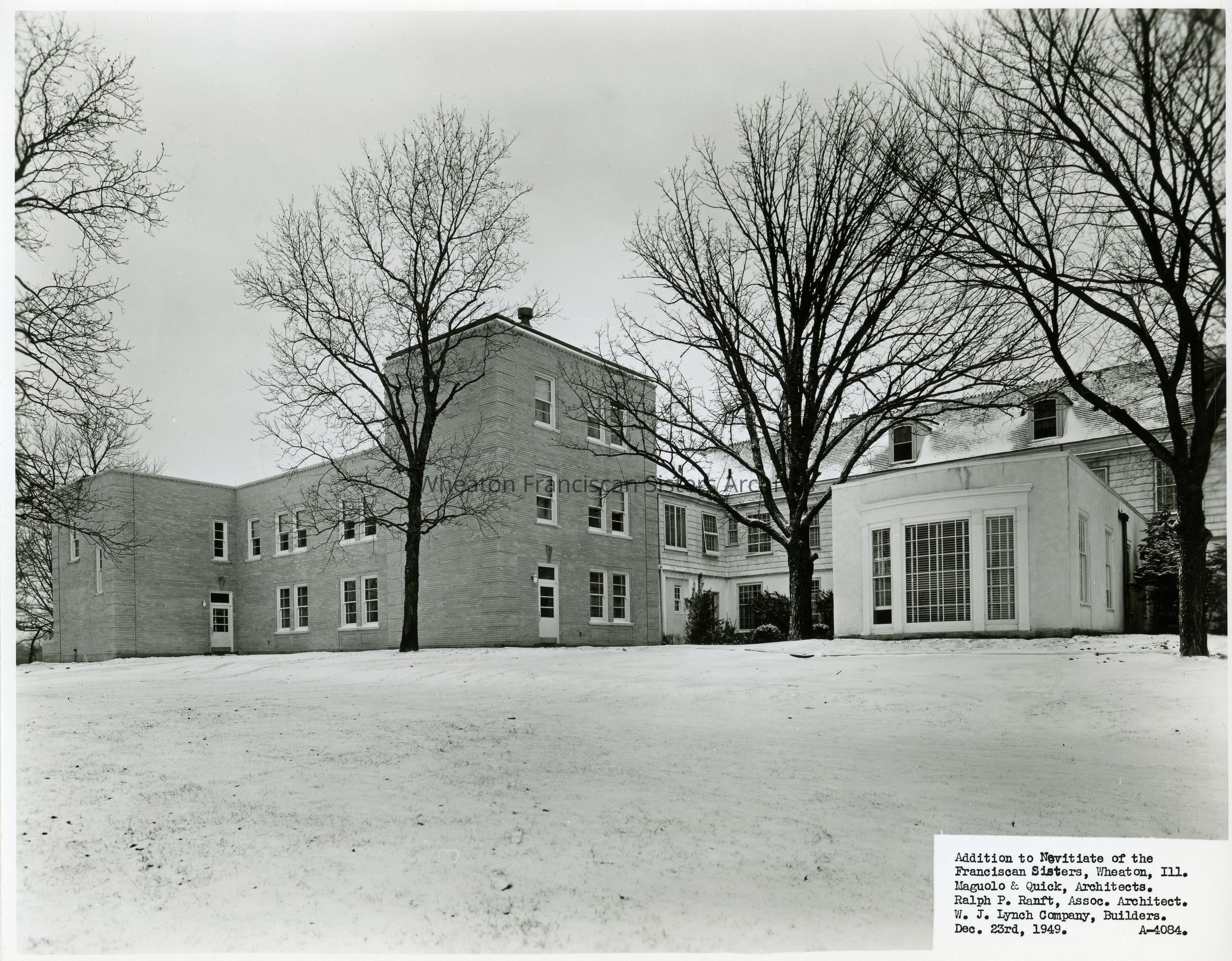 The rear of the Novitiate, also known as Kara Hall, in Wheaton, Illinois. The completed addition is on the left while an extension of the dining room is on the right. Visible in the background, the original home was constructed in 1902 and was first known as the Hurley House. Designed by architect Jarvis Hunt, it was the personal residence of Edward N. Hurley Sr. The photo lists Maguolo & Quick as architects, Ralph P. Ranft as associate architects and the W.J. Lynch Company as builders.