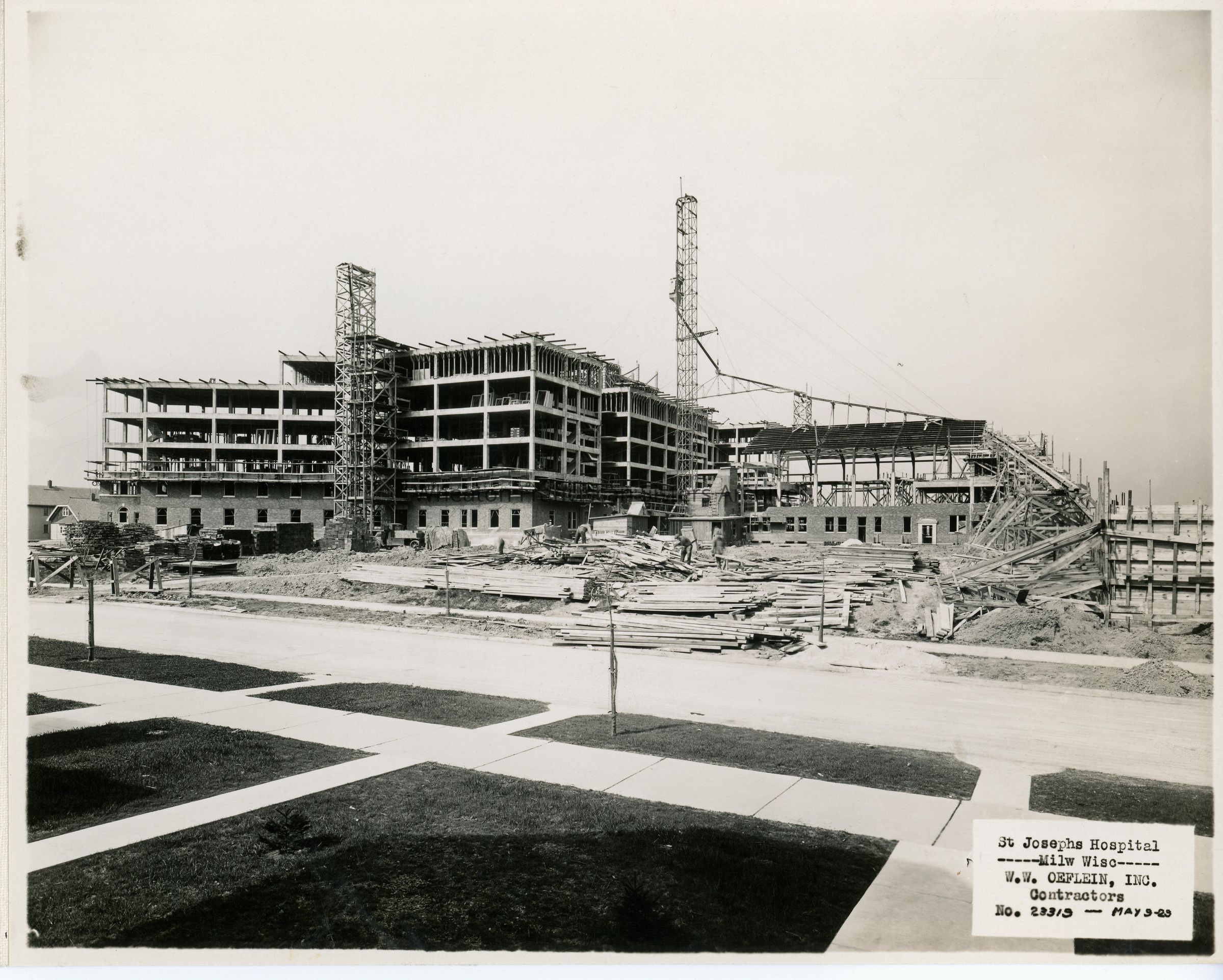 Construction of St. Joseph's Hospital located at 5000 West Chambers Street in Milwaukee, Wisconsin. The contractor is listed as W. W. Oeflein Inc.