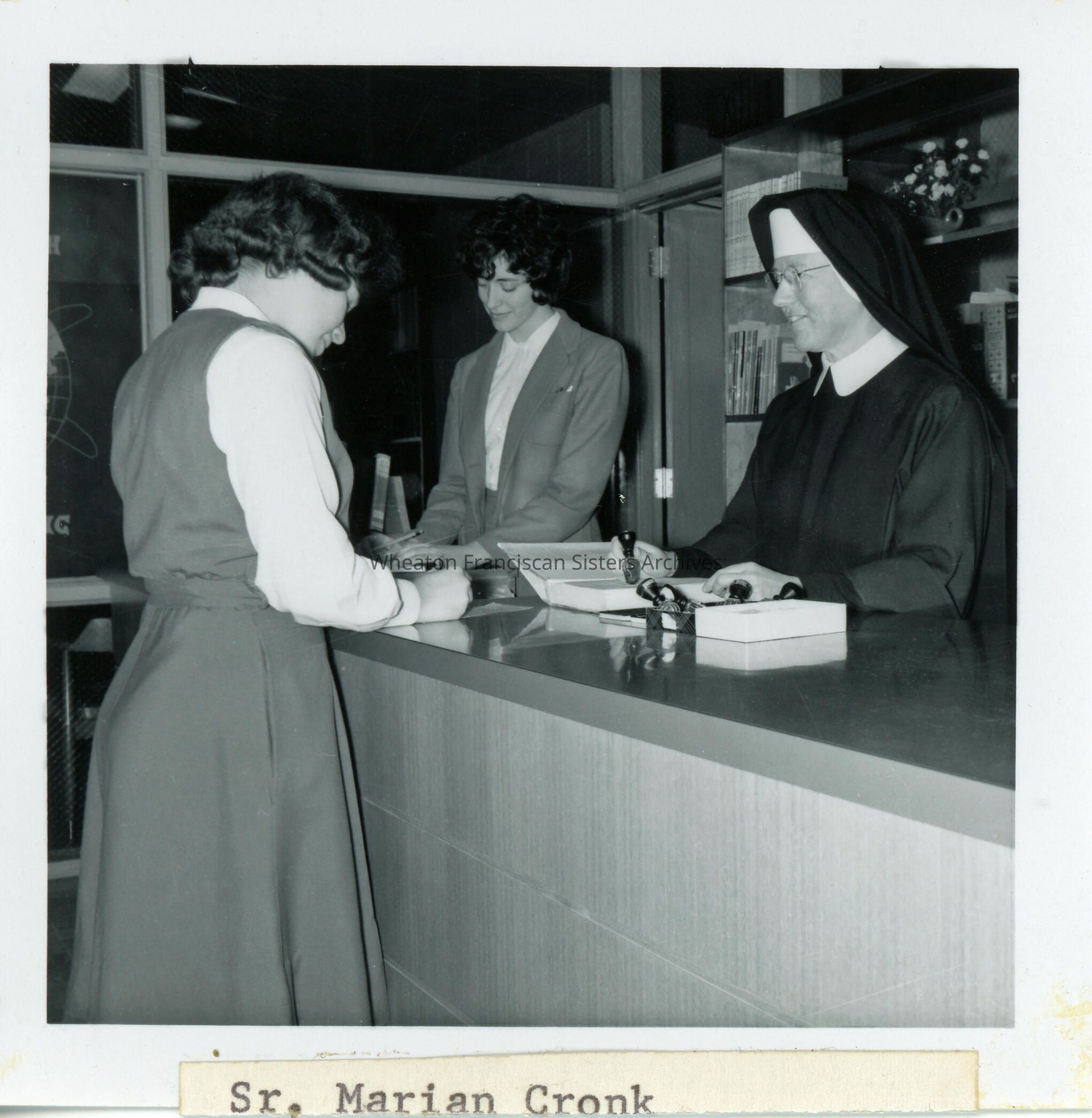 St. Francis High School located at 2130 West Roosevelt Road in Wheaton, Illinois. This image features Sister Marion (Claude) Cronk with students in the library.