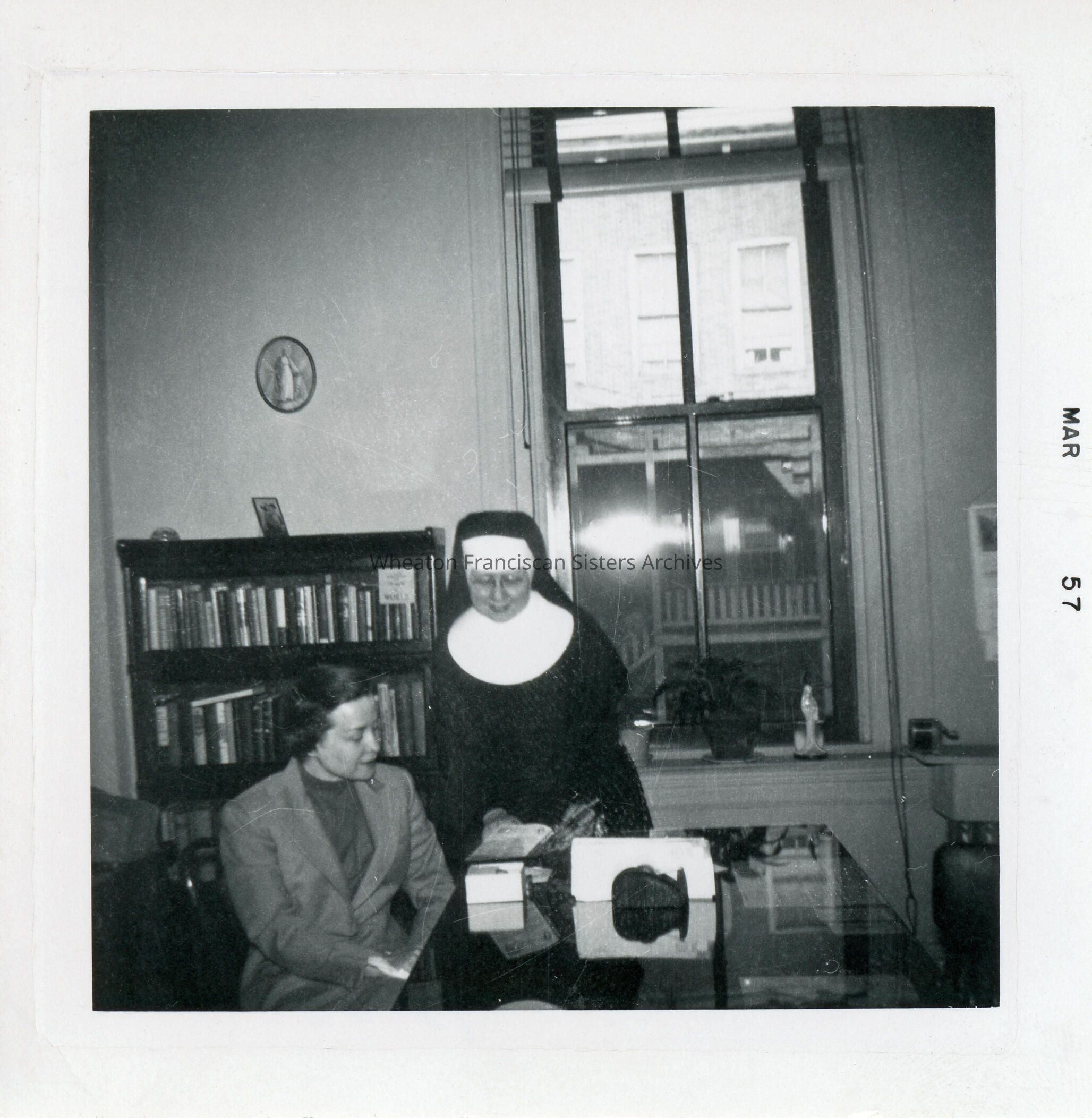 The House of Providence located at 1121 North Orleans Street in Chicago, Illinois. Sister Catherina (Miriam) Reinsbach is speaking to an unidentified resident.