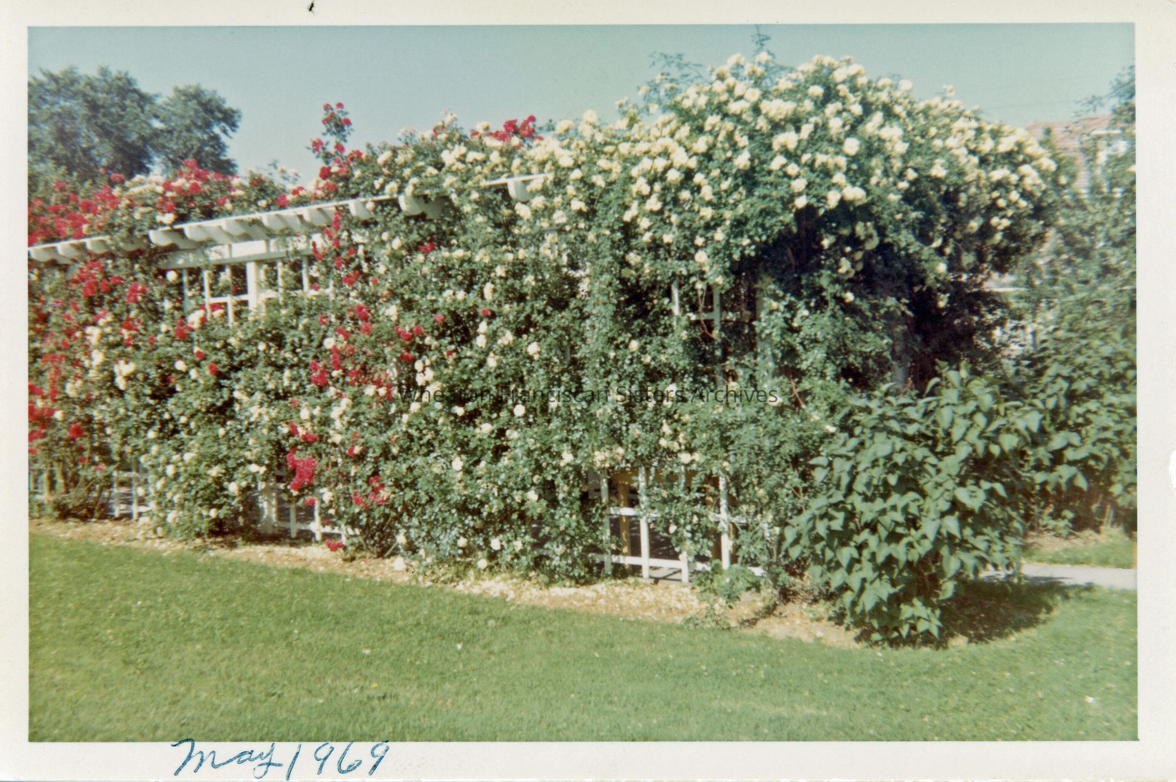St. Francis Hospital at 825 Good Hope Street in Cape Girardeau, Missouri. The image features a nearby rose garden. Opened in 1914, this hospital replaced an older structure located at Sprigg and Williams Streets. St. Francis remained here until 1976 and the building was demolished in 2000. Affordable housing now occupies the site.