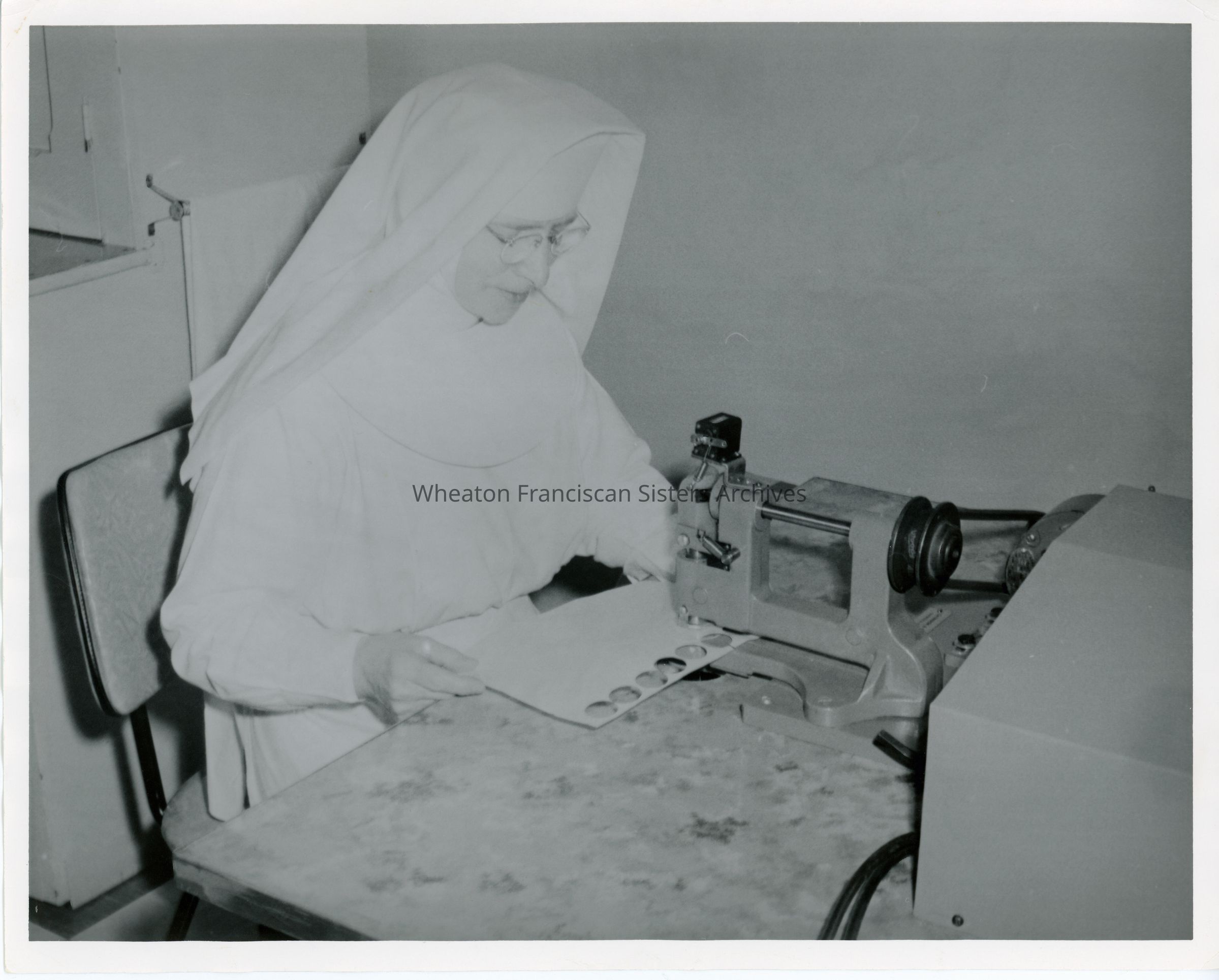 St. Rose Residence located at 952 10th Street in Denver, Colorado. A home for young working women, this image features Sister Helena (Olga) Koch making altar bread. At different times, this location was known as St. Clara's Convent, St. Rose's Convent, St. Rosa's Home and was once the site of St. Clara's Orphanage.