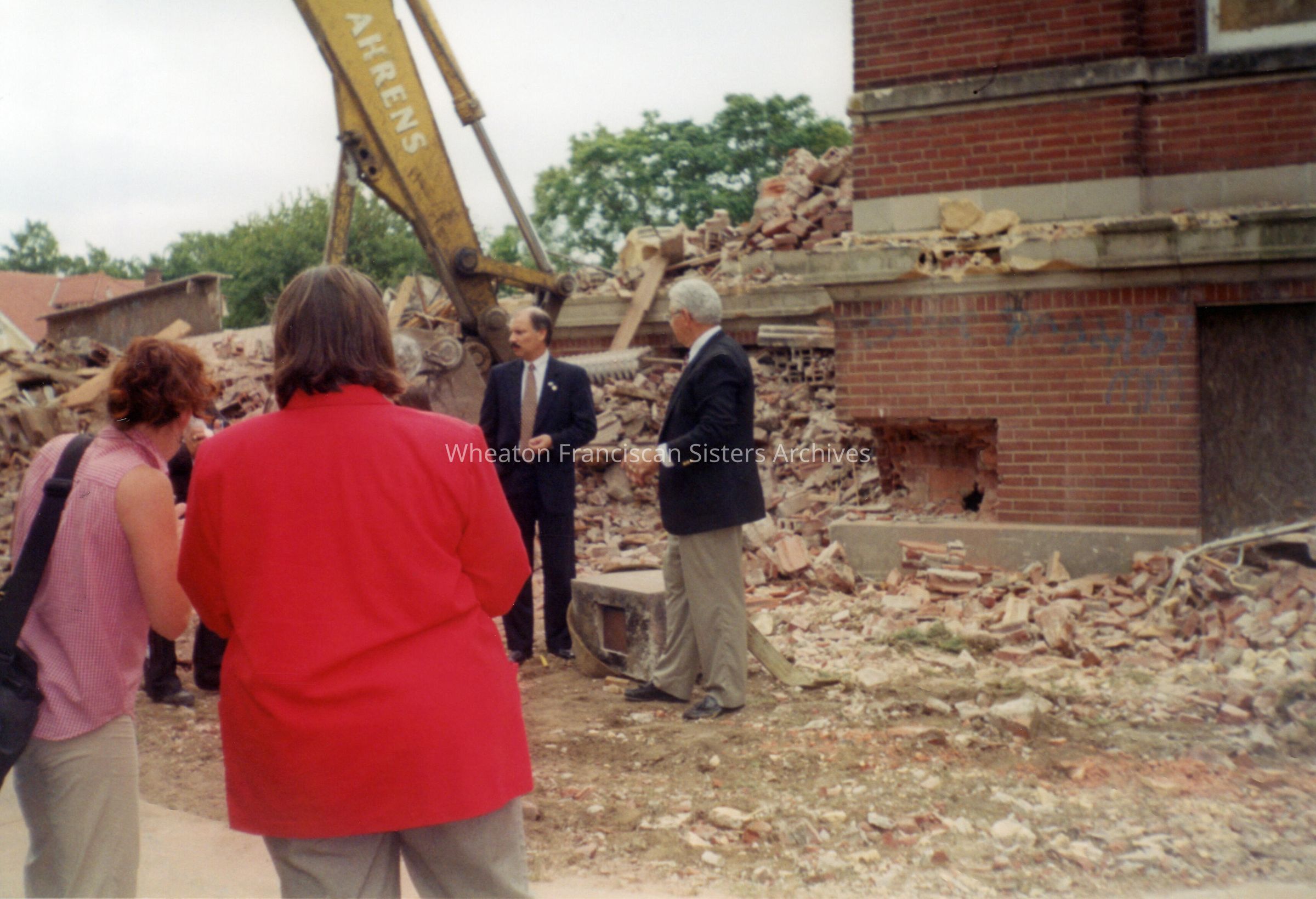 Demolition of St. Francis Hospital located at 825 Good Hope Street in Cape Girardeau, Missouri. This image was taken during the removal of the cornerstone time capsule. Opened in 1914, the hospital replaced an older structure located at Sprigg and Williams Streets. St. Francis remained here until 1976 and the building was demolished in 2000. Affordable housing now occupies the site.