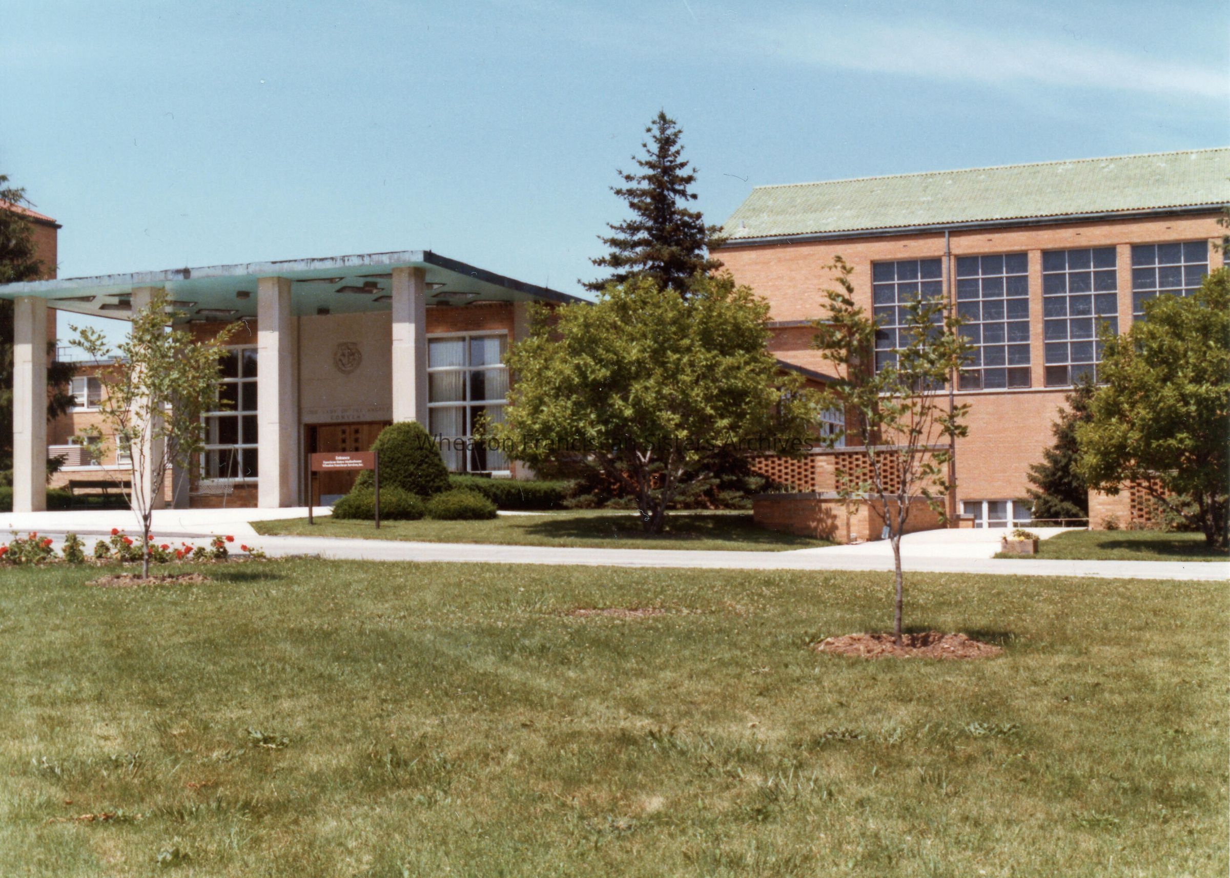 The Our Lady of Angels Motherhouse at 26W171 Roosevelt Road in Wheaton, Illinois. Looking southwest the main entrance, later known as entrance seven, is pictured. A nearby sign lists Wheaton Franciscan Sisters Incorporated. The chapel and grotto are also visible on the right.
