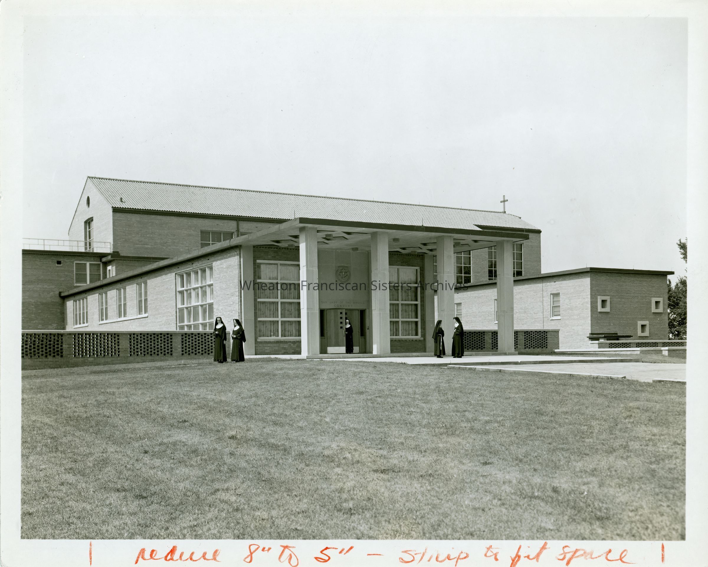 The Our Lady of Angels Motherhouse and Novitiate at 26W171 Roosevelt Road in Wheaton, Illinois. This image looks northwest toward the front entrance, later known as entrance seven. The chapel is visible in the background and five Sisters are present.