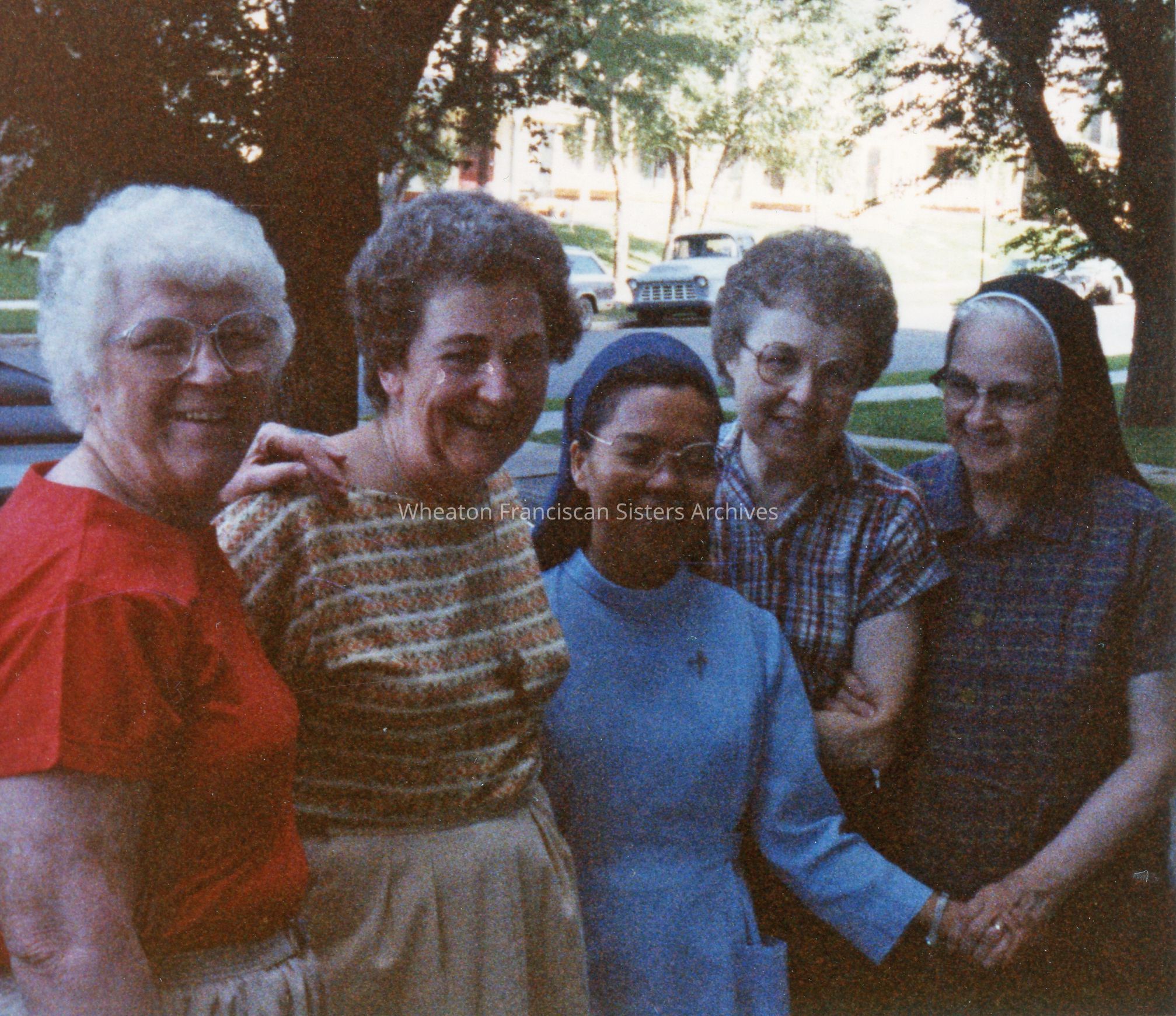 Sisters visiting Francis Heights located at 26th Avenue and Osceola Street in Denver, Colorado. From left to right are Sister Magdalene "Maggie" (Daniel) Ryan, Sister Elizabeth (Marina/Beth) Cosgrove, an unidentified Indonesian Sister, Sister Theresa (Pauline) Langfield and Sister Josephine (Leonita) Irvington.