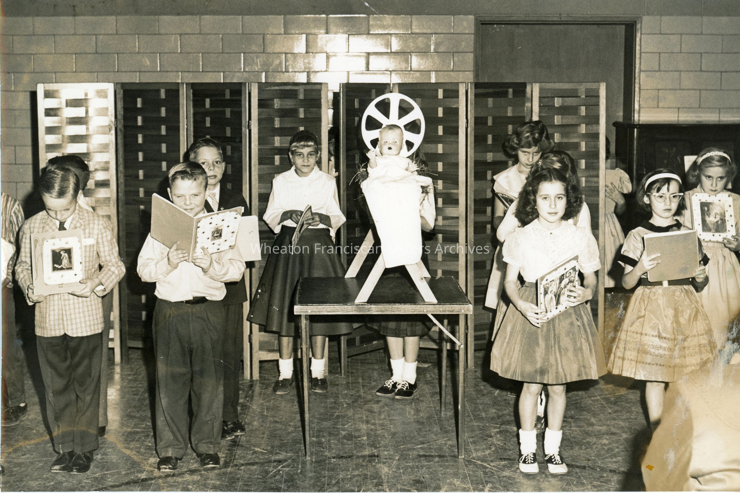 Christmas Pageant at Transfiguration School in Wauconda, Illinois. Students are performing near a display of the Infant Jesus.