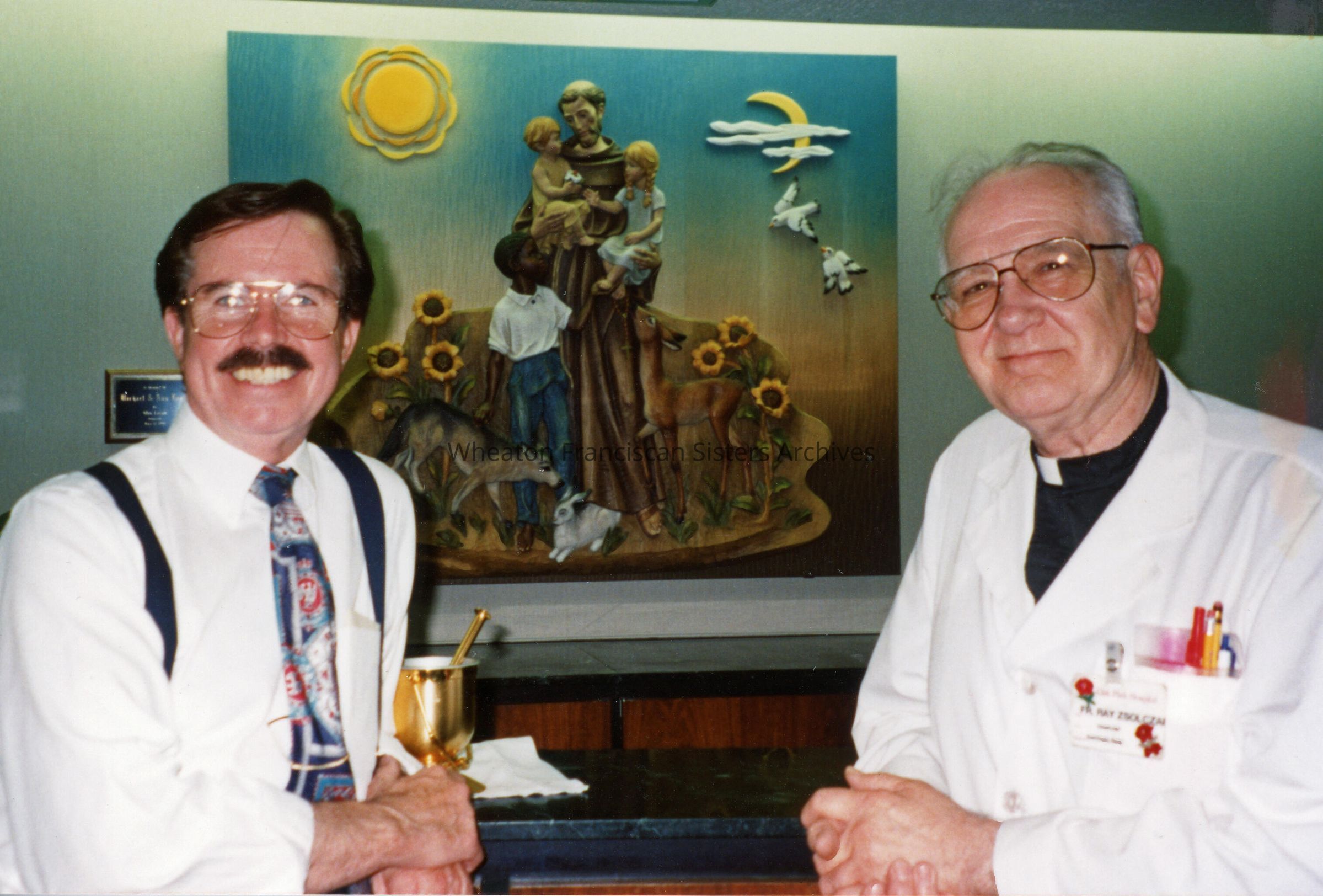 Oak Park Hospital located at 520 South Maple Avenue in Oak Park, Illinois. This image features the presentation and blessing of a St. Francis wood carving. Pictured are Brother Michael May (left) and Father Ray Zsolczai (right).
