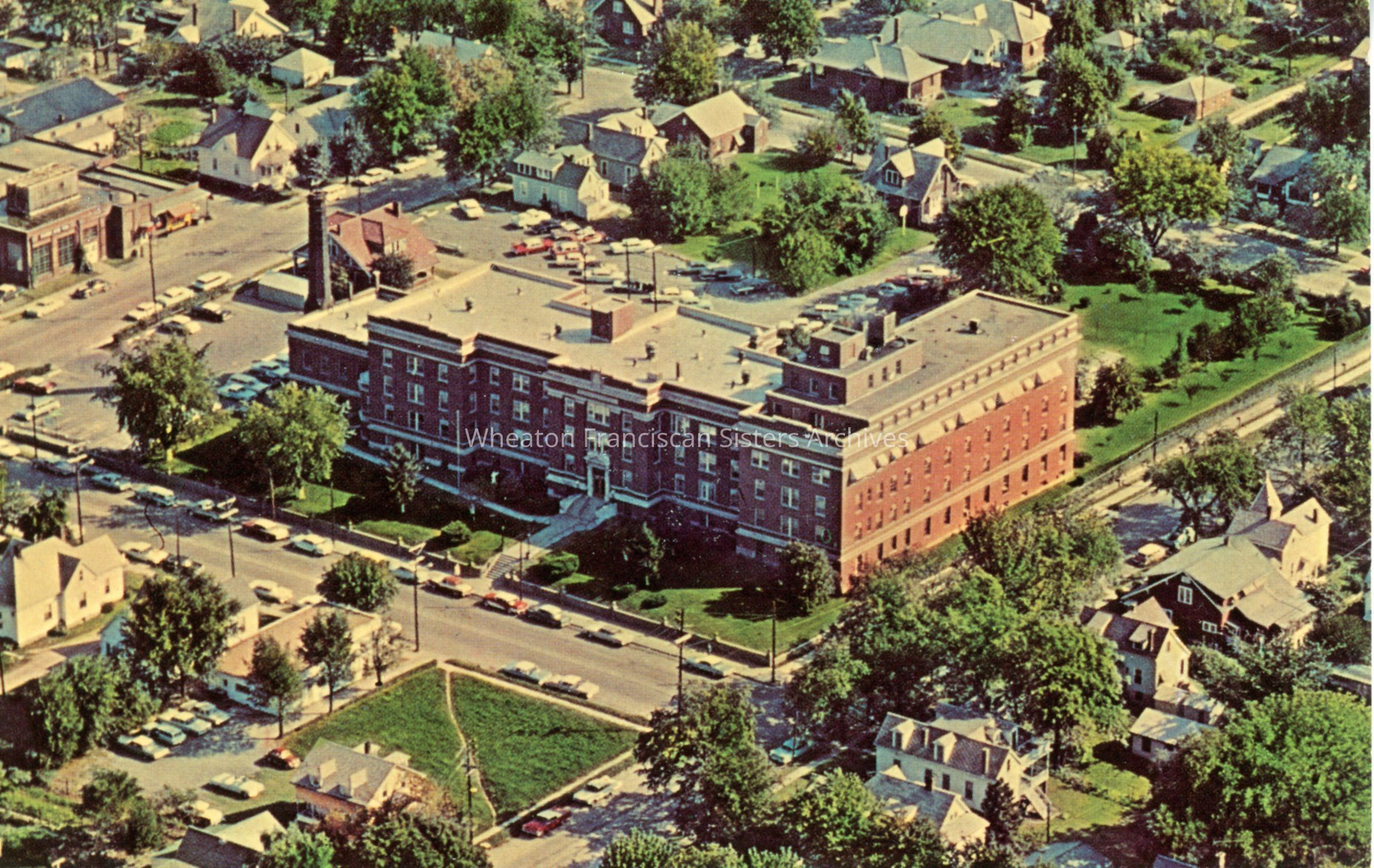 Postcard featuring an aerial view of St. Francis Hospital at 825 Good Hope Street in Cape Girardeau, Missouri. Opened in 1914, this building replaced an older structure located at Sprigg and Williams Streets. St. Francis remained here until 1976 and the building was demolished in 2000. Affordable housing now occupies the site.