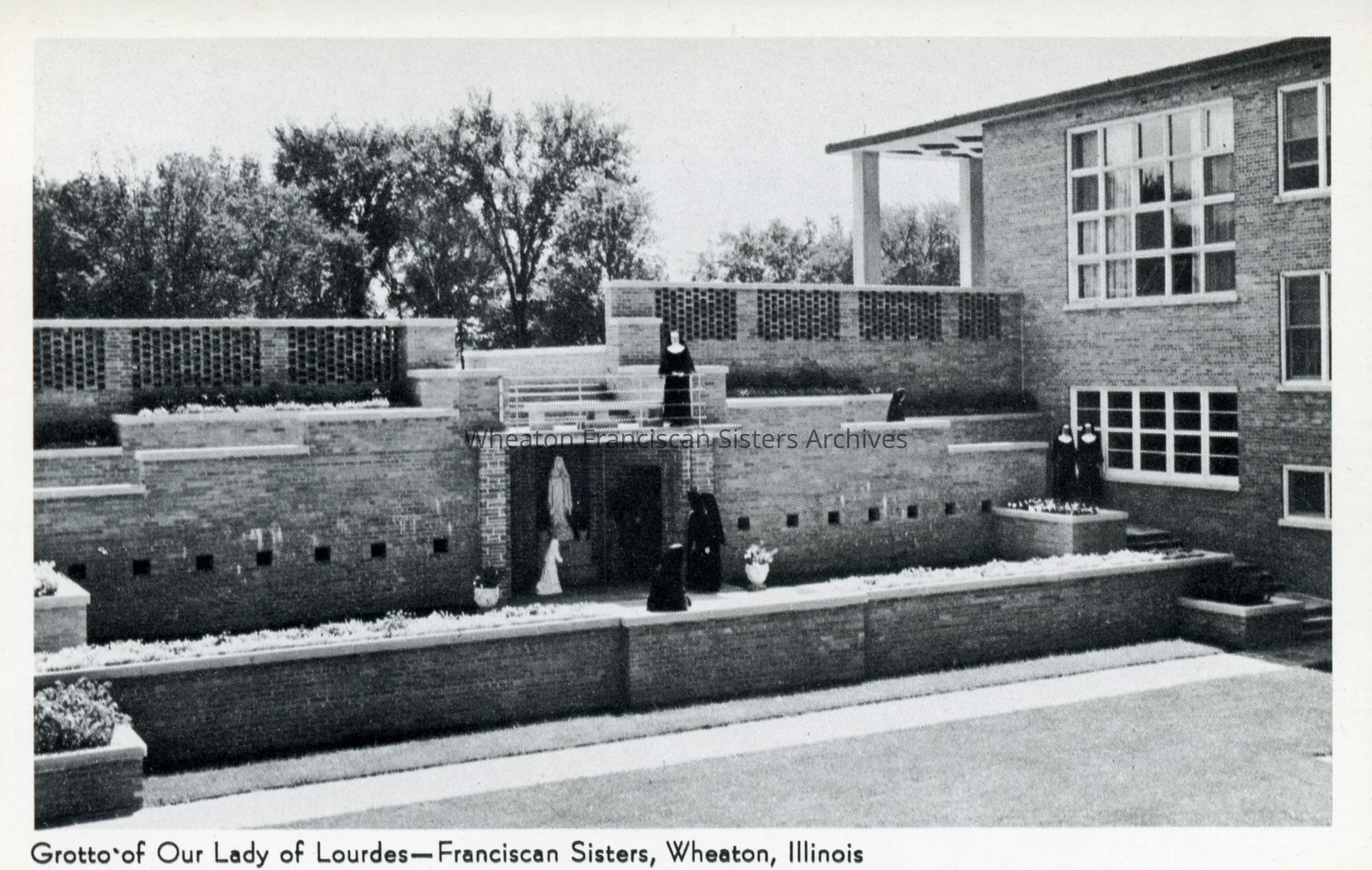 Postcard of the Our Lady of Angels Motherhouse and Novitiate at 26W171 Roosevelt Road in Wheaton, Illinois. This image features Sisters in the grotto.