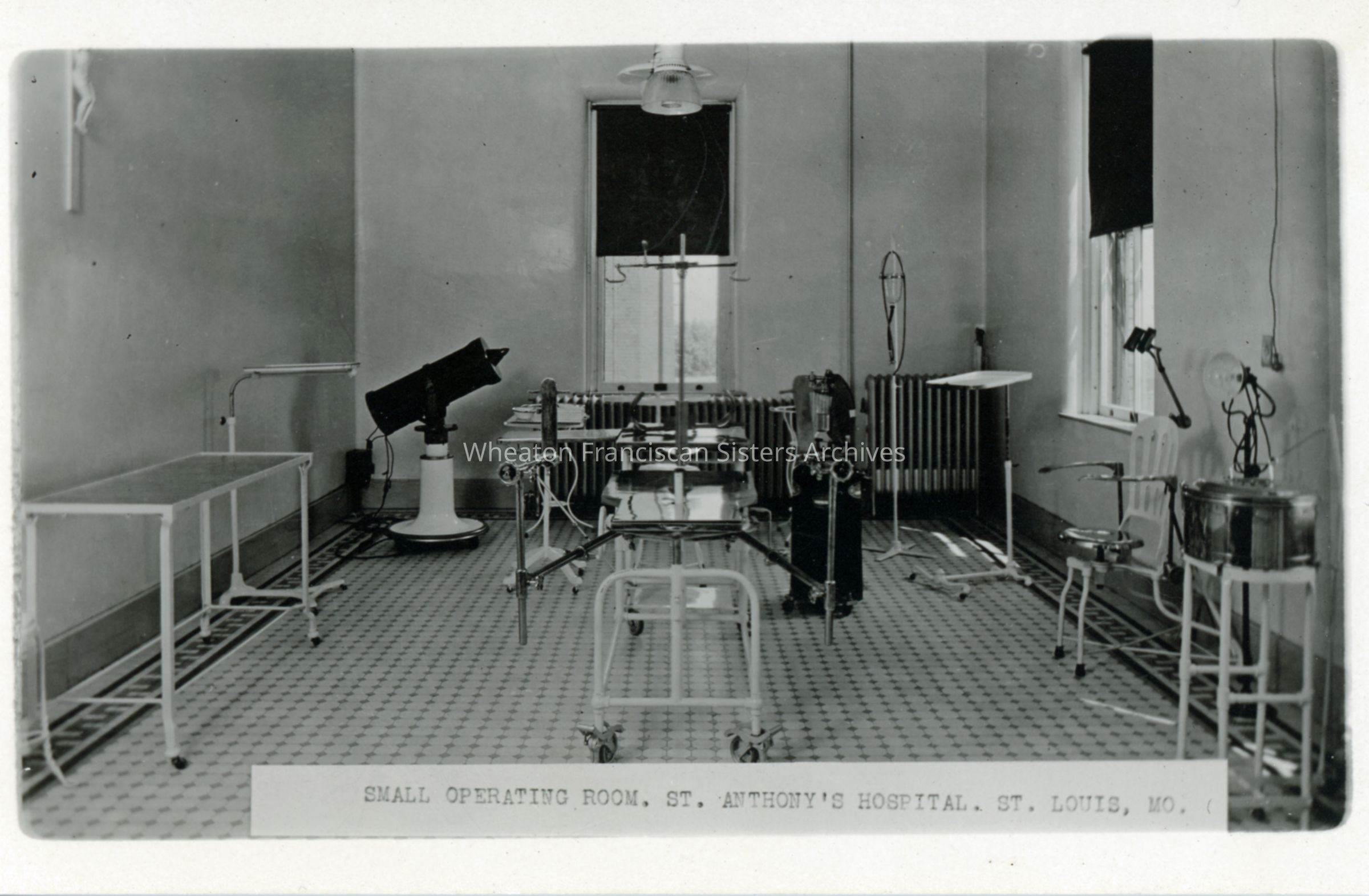Postcard of the small operating room in St. Anthony’s Hospital located at 3520 Chippewa Street in St. Louis, Missouri.