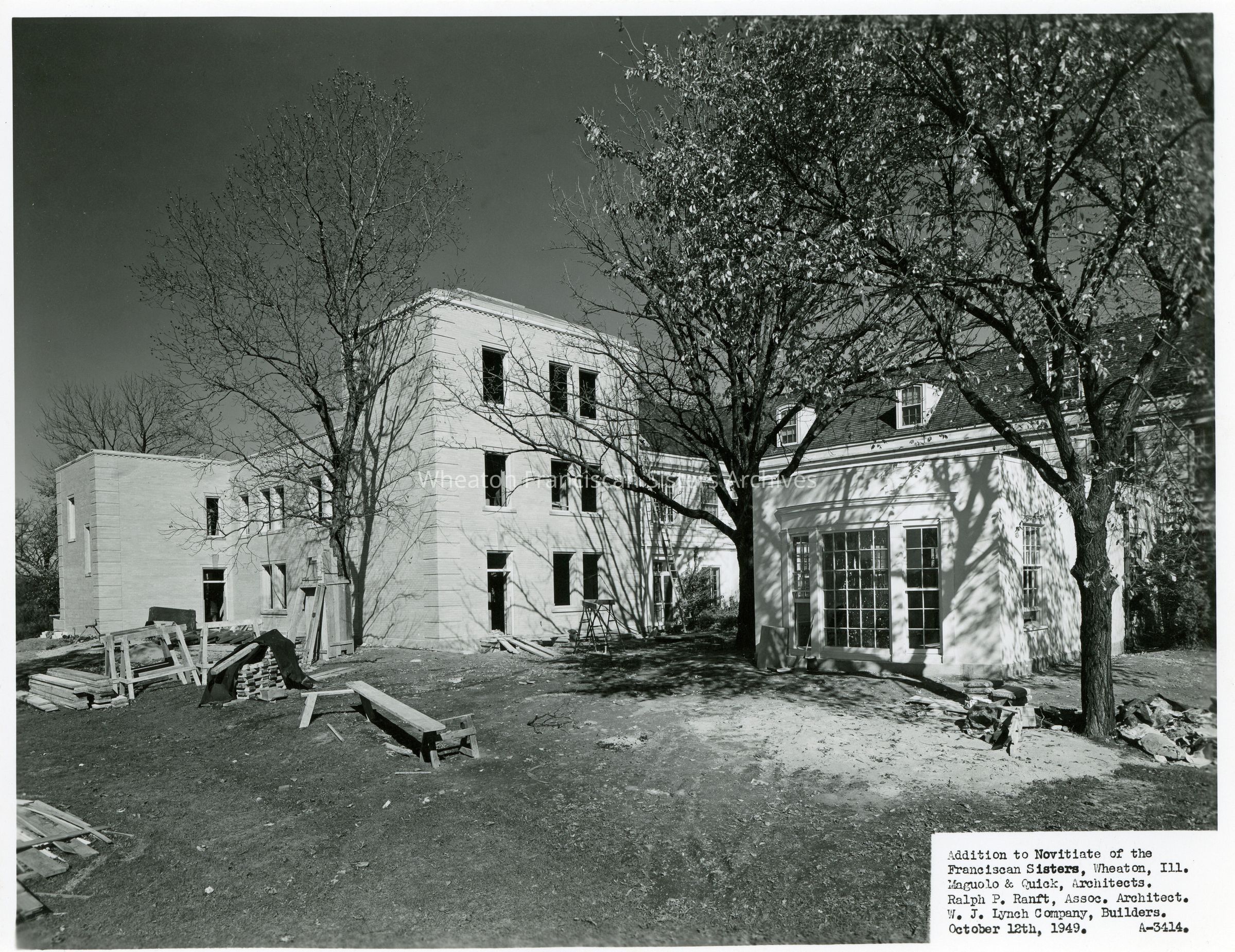 Nearing completion, an addition to the Novitiate, also known as Kara Hall, is pictured in Wheaton, Illinois. Visible in the background on the right, the original home was constructed in 1902 and was first known as the Hurley House. Designed by architect Jarvis Hunt, it was the personal residence of Edward N. Hurley Sr. The photo lists Maguolo & Quick as architects, Ralph P. Ranft as associate architects and the W.J. Lynch Company as builders.