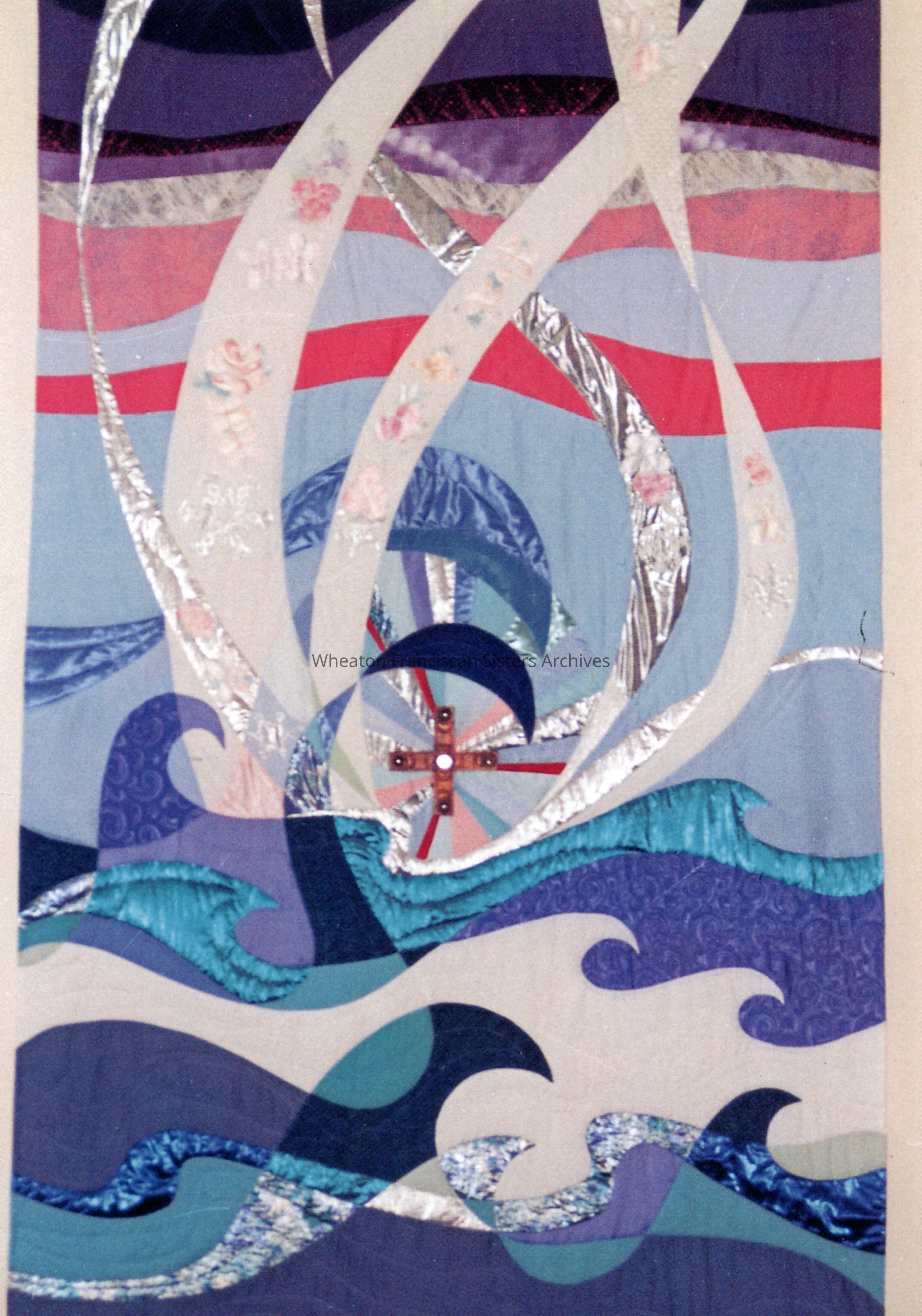 Postcard of quilted artwork honoring the Franciscan Sisters who perished on the S.S. Deutschland in December of 1875. The quilt is the centerpiece of the Deutschland Chapel located at the Our Lady of Angels Motherhouse in Wheaton, Illinois. The small cross in the center consists of five spheres, four of which contain a piece of habit representing a recovered Sister. The ship sank after it ran aground off Harwich during a heavy winter storm. Although five Sisters were on the vessel, the body of Sister Henrica (Catherine) Fassbender was never recovered. The four other Sisters who lost their lives are Sister Barbara (Thekla) Hültenschmidt, Sister Brigitta (Elisabeth) Damhorst, Sister Norberta (Johanna) Reinkober and Sister Aurea (Josepha) Badziura. The women were traveling from the motherhouse in Salzkotten, Germany to St. Louis to lead the new American mission.Context