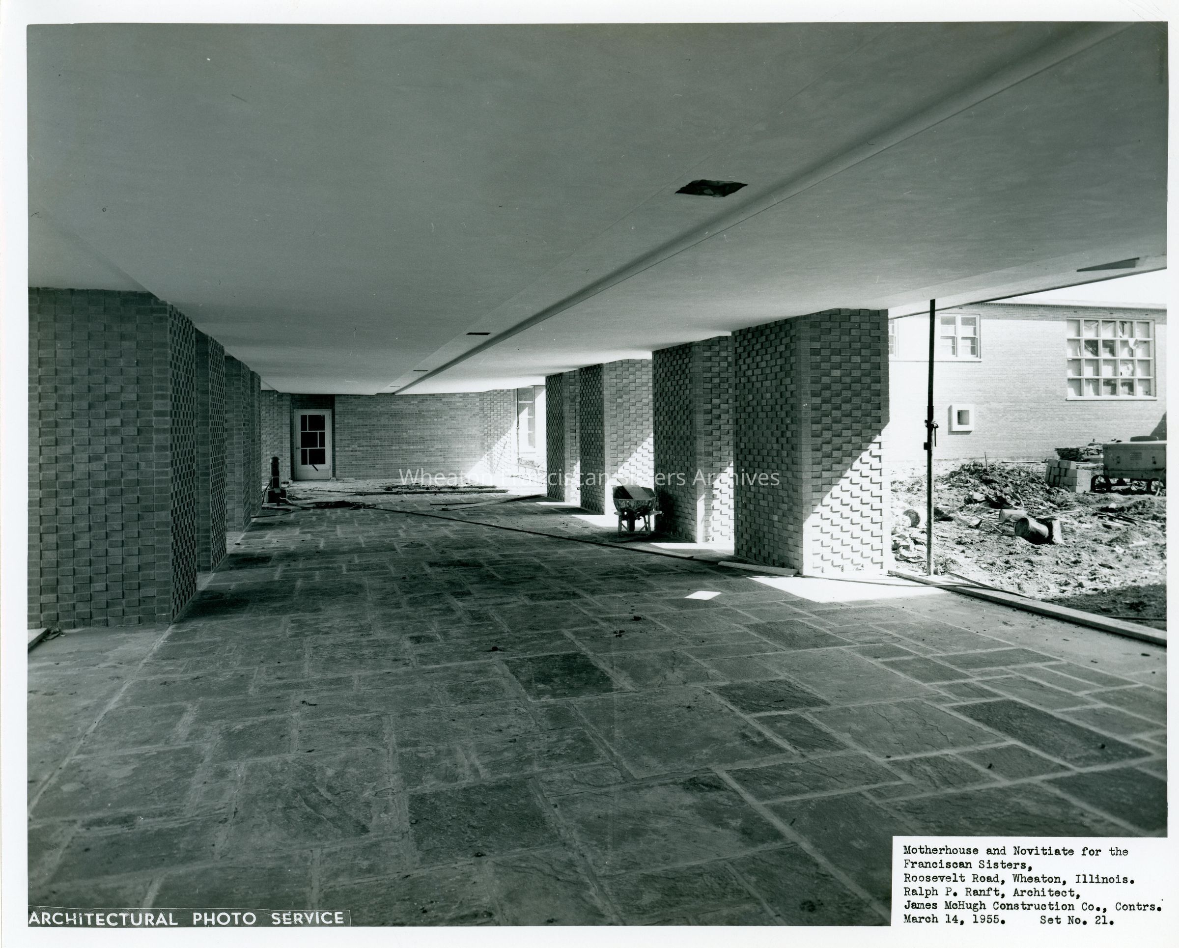 Construction of the Our Lady of Angels Motherhouse and Novitiate at 26W171 Roosevelt Road in Wheaton, Illinois. This image looks north near the inner courtyard. The photo lists Ralph P. Ranft as the architect and James McHugh Construction as the contractor.