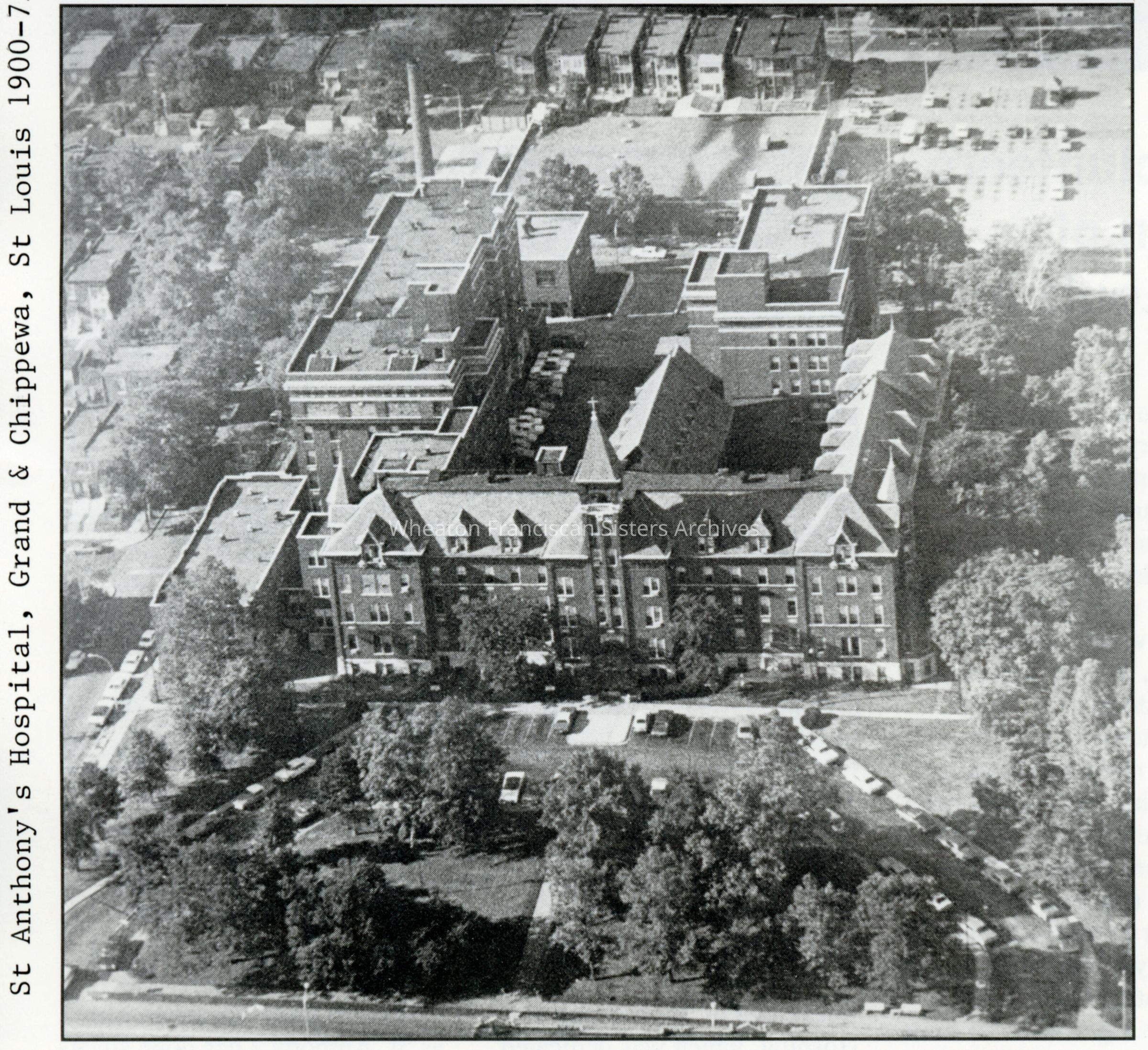 Founded in 1894, St. Anthony's Hospital was located at Grand Avenue and Chippewa Street in St. Louis, Missouri. In 1900, a new building was constructed to meet growing demand for medical services. Over the following decades the hospital received numerous additions, and until 1947, was also home to the Sister's Novitiate and Motherhouse. In 1967, sponsorship of St. Anthony's was transferred to a board of community leaders. Requiring more space, the hospital relocated further southwest in 1975, and the buildings at Grand Avenue and Chippewa Street were demolished shortly after.Context