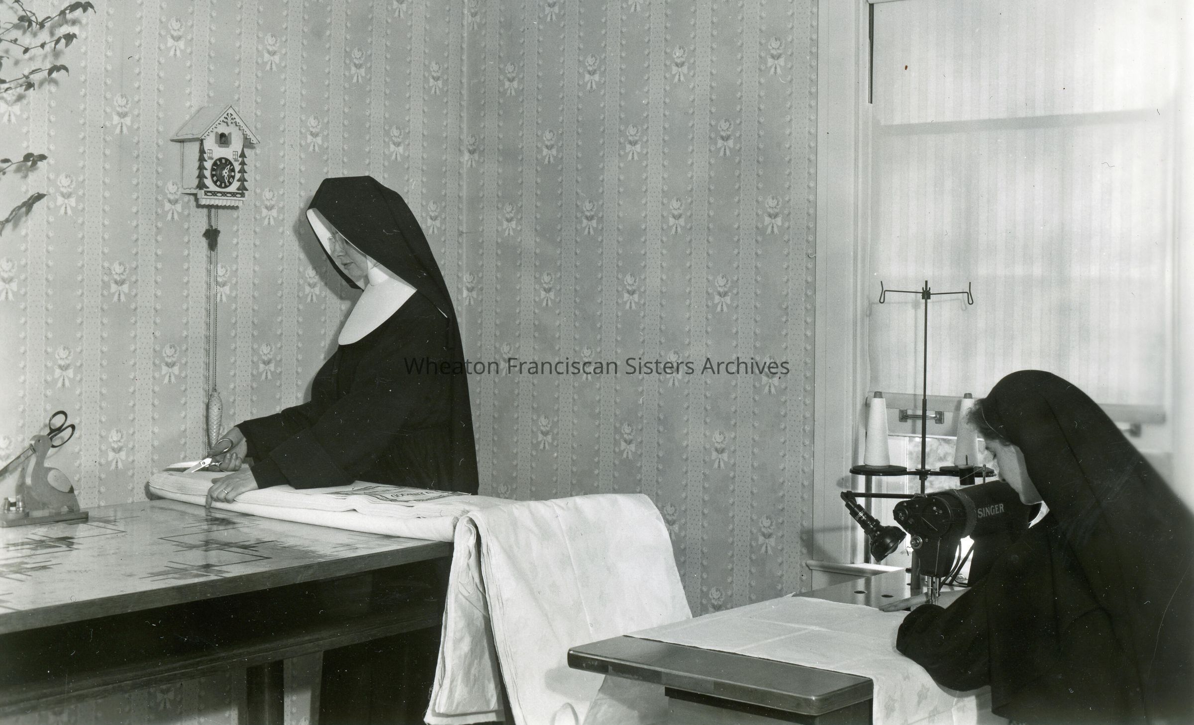 The Motherhouse, also known as Maura Hall, in Wheaton, Illinois. This image features the interior of a sewing room. From left to right are Sister Ottilia (Adorine) Fischels and Postulant Jean (Marianne) Robinson. Constructed around 1930, this home was a wedding gift to Helen Hurley Ryan, daughter of Edward N. Hurley Sr.