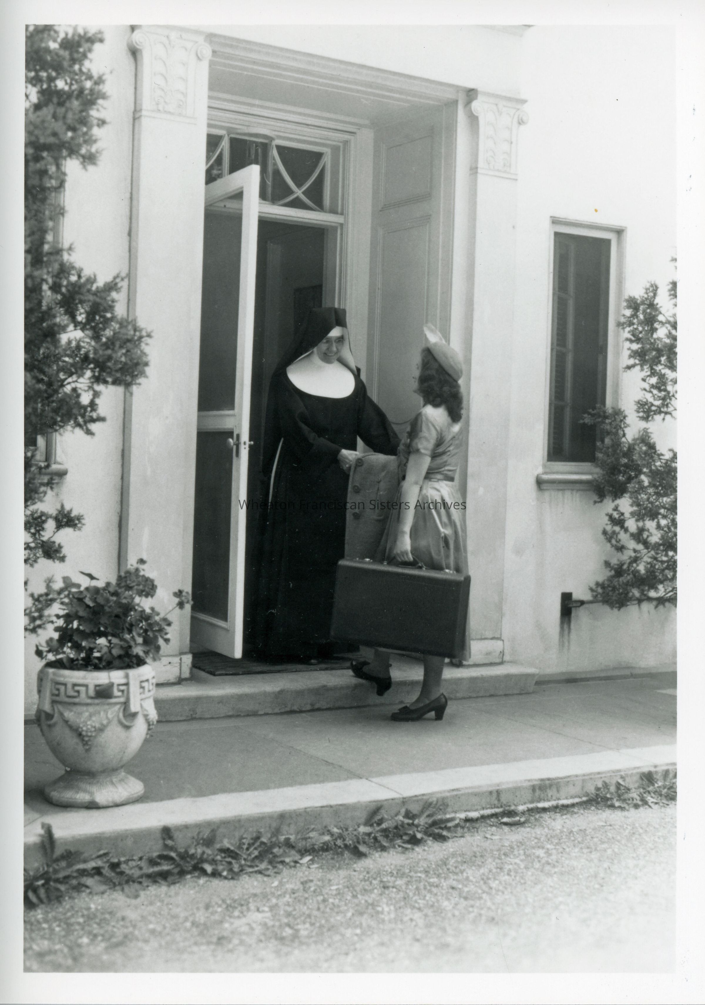 The Novitiate, also known as Kara Hall, in Wheaton, Illinois. Sister Frances (Wilma) Meyer is welcoming a young woman inside. Constructed in 1902 and first known as the Hurley House, the home was designed by architect Jarvis Hunt and was the personal residence of Edward N. Hurley Sr.