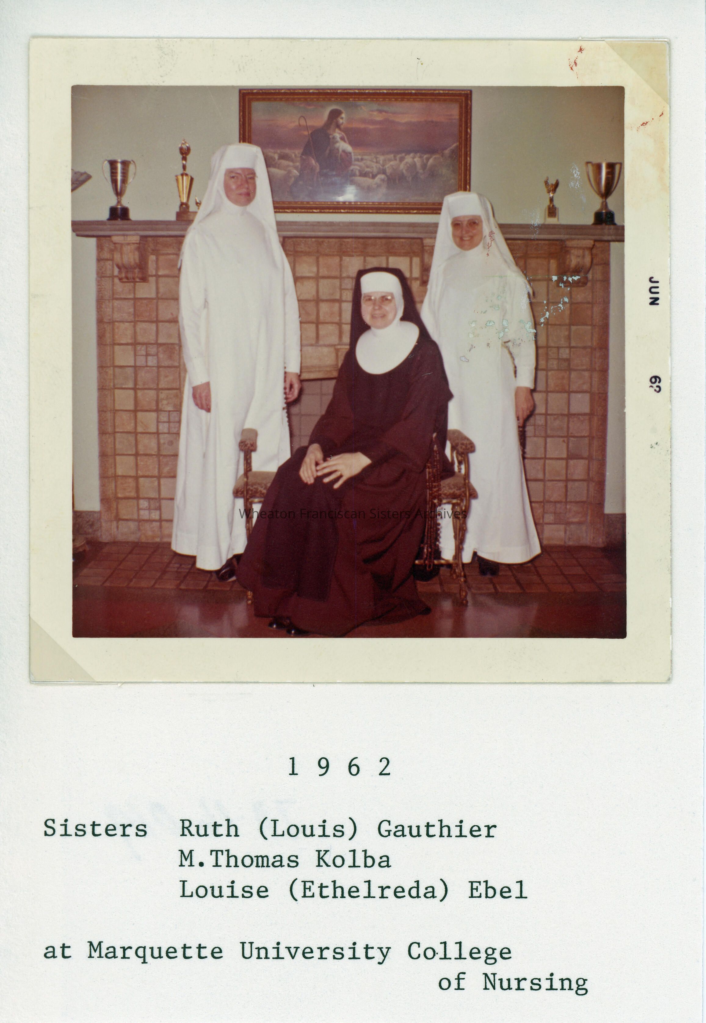 The Marquette University College of Nursing, formerly the St. Joseph's Hospital School of Nursing. Pictured are Sister Ruth (Louis) Gauthier, Sister Julia (Thomas) Kolba and Sister Louise (Ethelreda) Ebel.