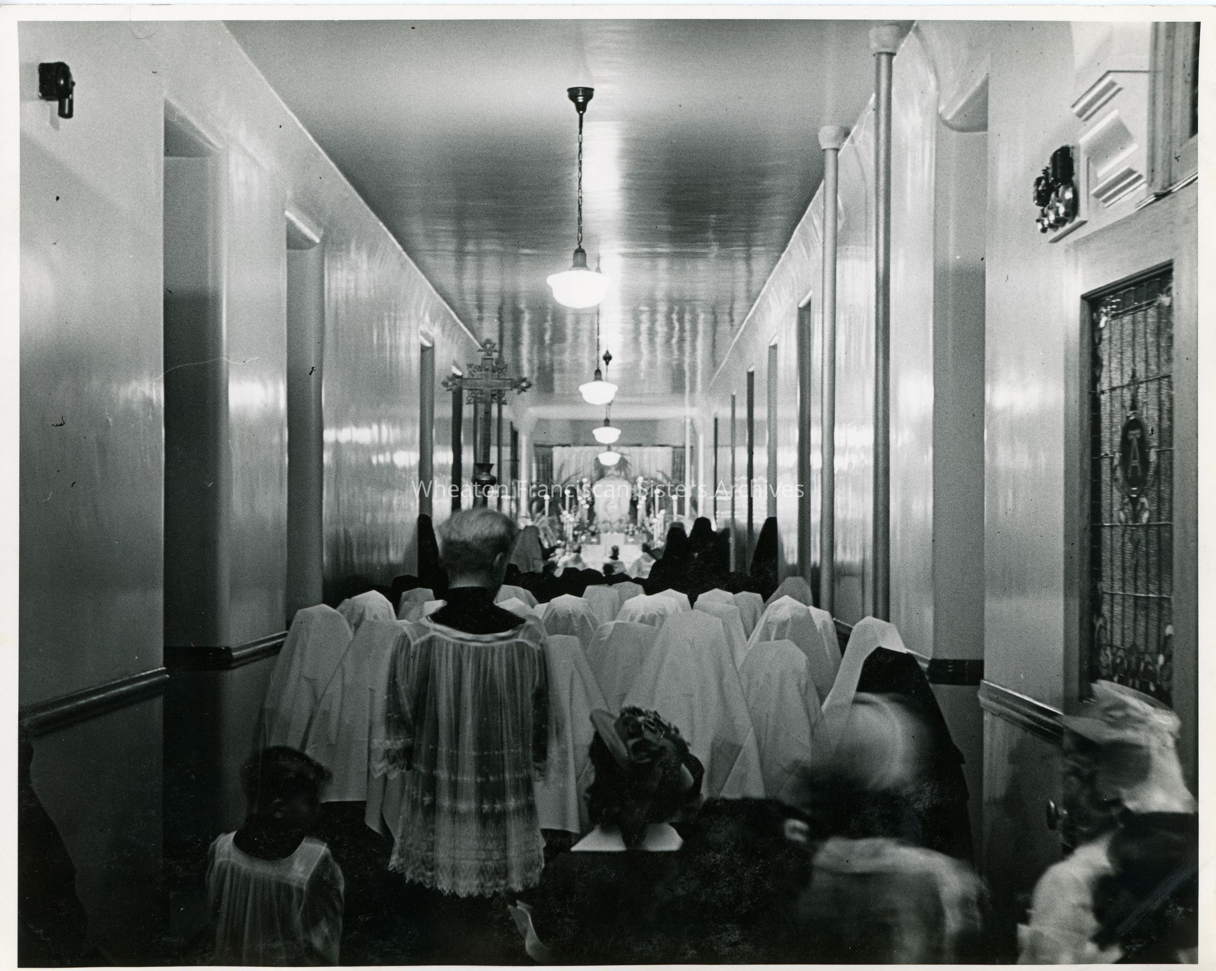 A procession for the Feast of Corpus Christi in St. Anthony’s Hospital located at 3520 Chippewa Street in St. Louis, Missouri. There is a small altar in the background.