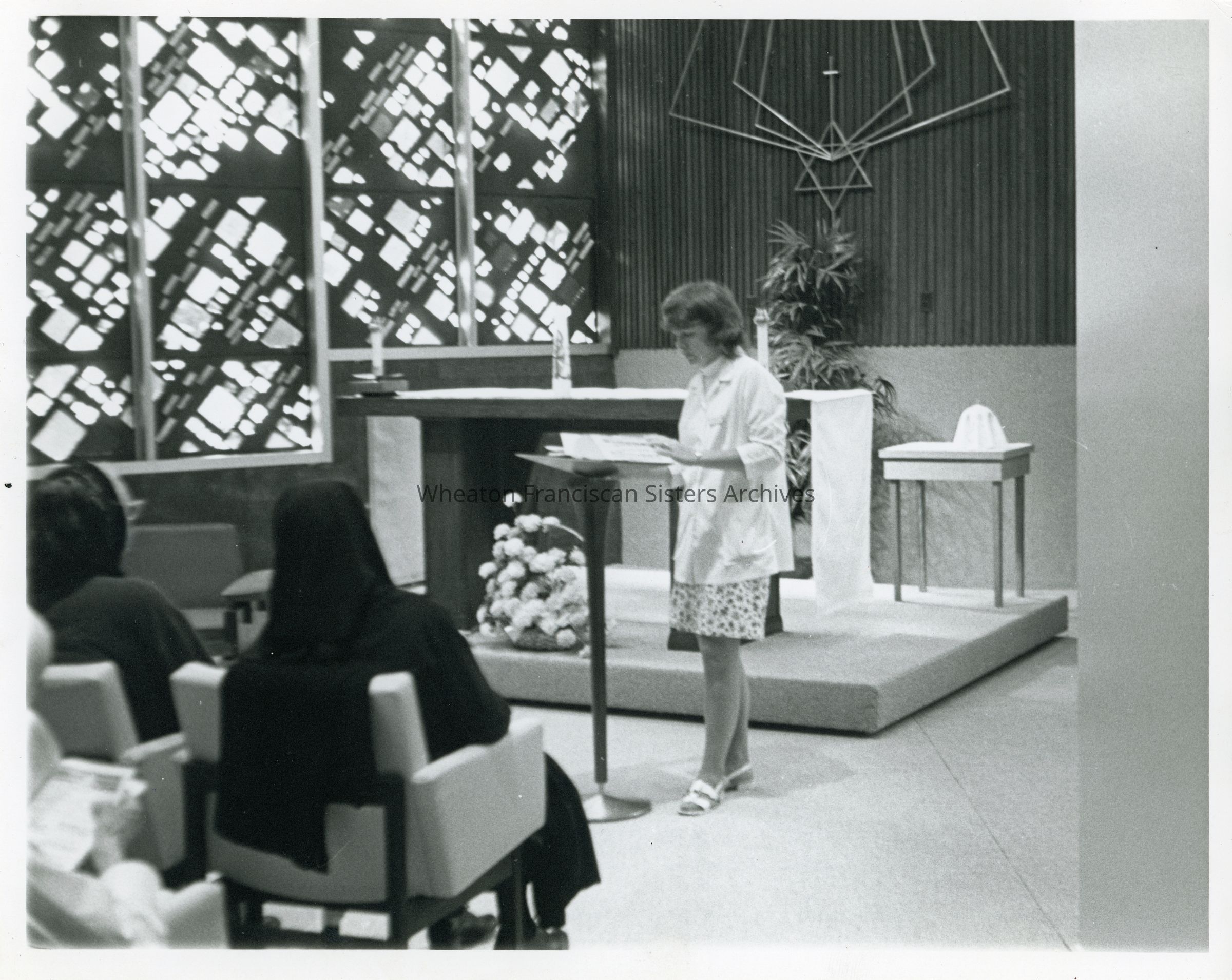 The chapel at Marianjoy Rehabilitation Hospital in Wheaton, Illinois. Sister Mary Ellen (Joellen) McAleese is speaking near the altar.