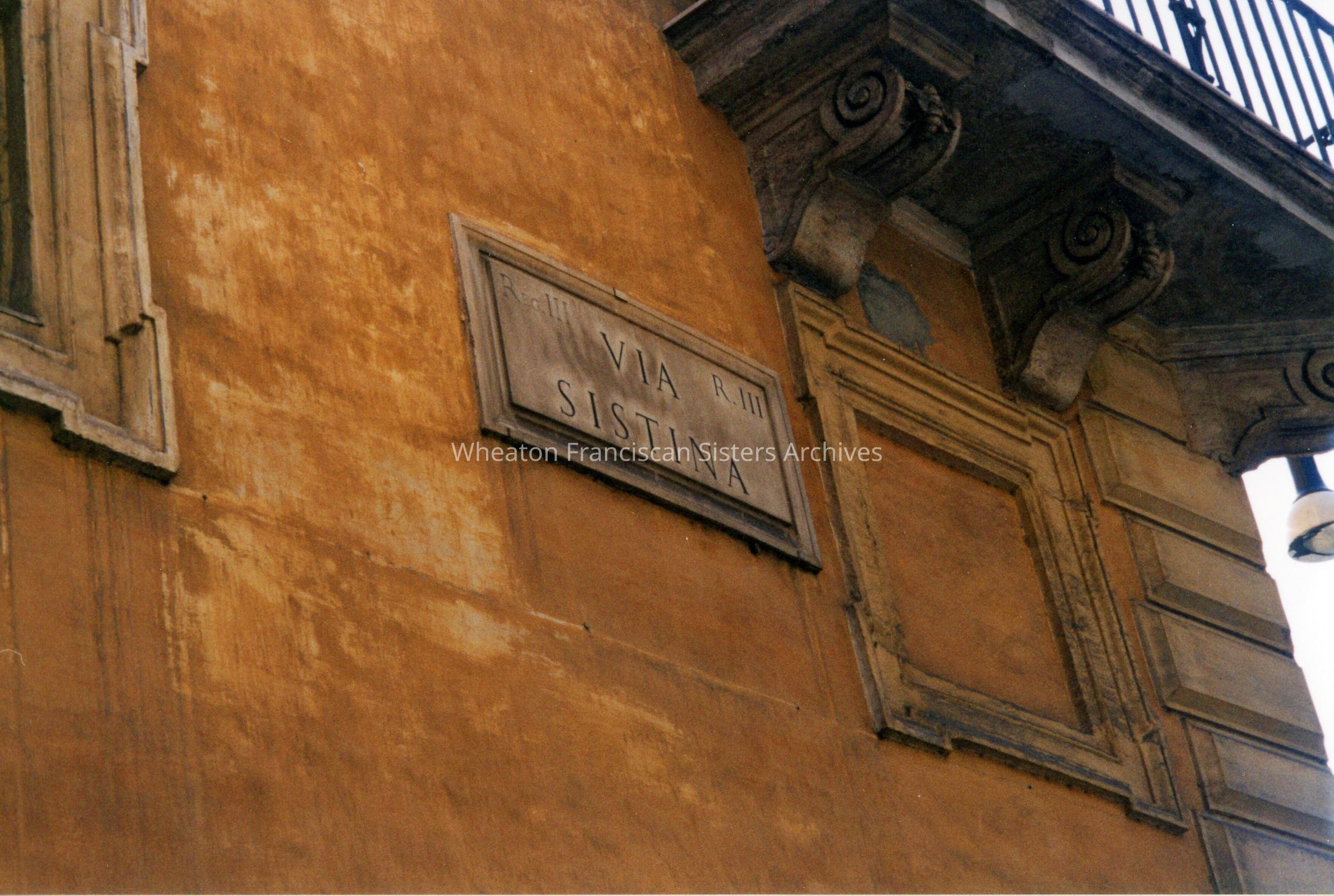 Sign on 149 Via Sistina in Rome, Italy. Mother Clara Pfaender arrived in Rome in February of 1881 and this location was her final residence. She passed away here on October 5th, 1882. An inscription on the building, not visible in this photo, reads "When in short time we leave this house / that others' hands have built for us, / we shall enter an everlasting house / that we have built with our own hands".