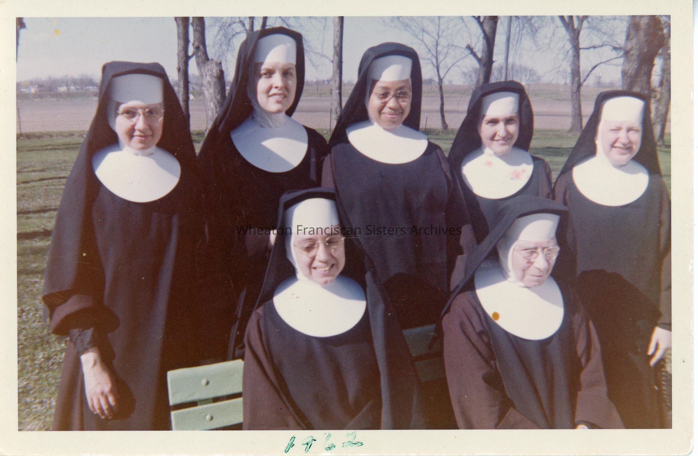 Sisters pictured on the campus of St. Francis Hospital located at 1360 Independence Avenue in Waterloo, Iowa. Several of the women taught at St. Joseph's Parochial School in nearby Raymond. In the back row, from left to right, are Sister Agnes (Dolorine) Chapla, Sister Nancy (Marcia) Zirkelbach, Sister Edwina (Francisca) Nibley, Sister Mary (Marlene) Bemis and Sister Ruth Mary/Linus Powers. In the front row, from left to right, are Sister Frieda (Janice) Teder and Sister Anna (Fortunata) Blessing.