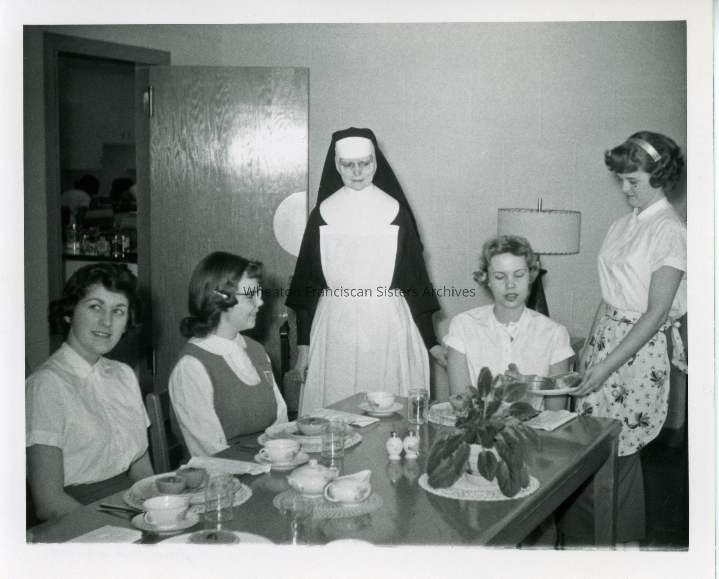 St. Francis High School located at 2130 West Roosevelt Road in Wheaton, Illinois. This image features Sister Hildegard (Lucille) Burgener teaching home economics.