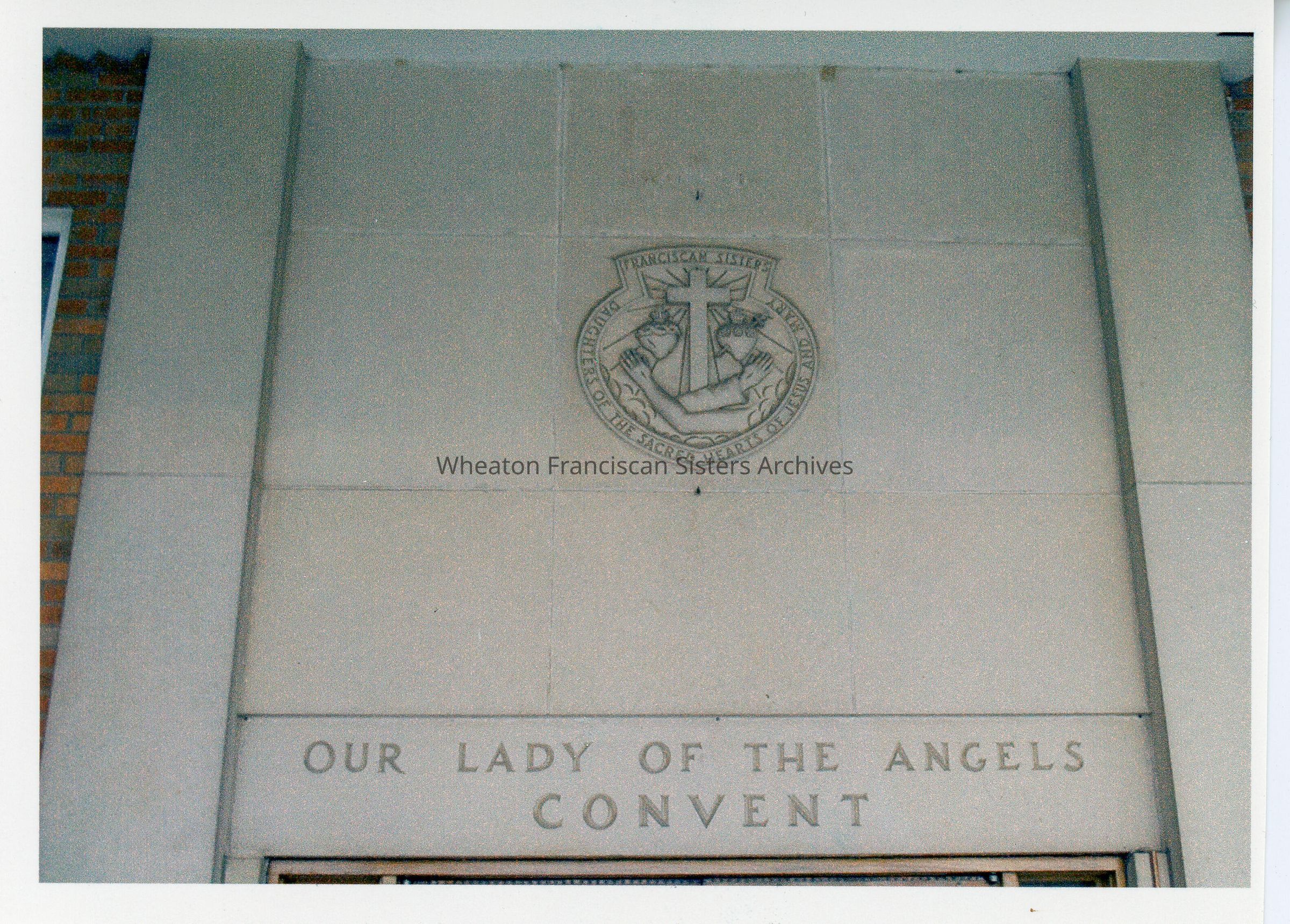 The Our Lady of Angels Motherhouse at 26W171 Roosevelt Road in Wheaton, Illinois. This image features the crest located just above the main entrance, later known as entrance seven.