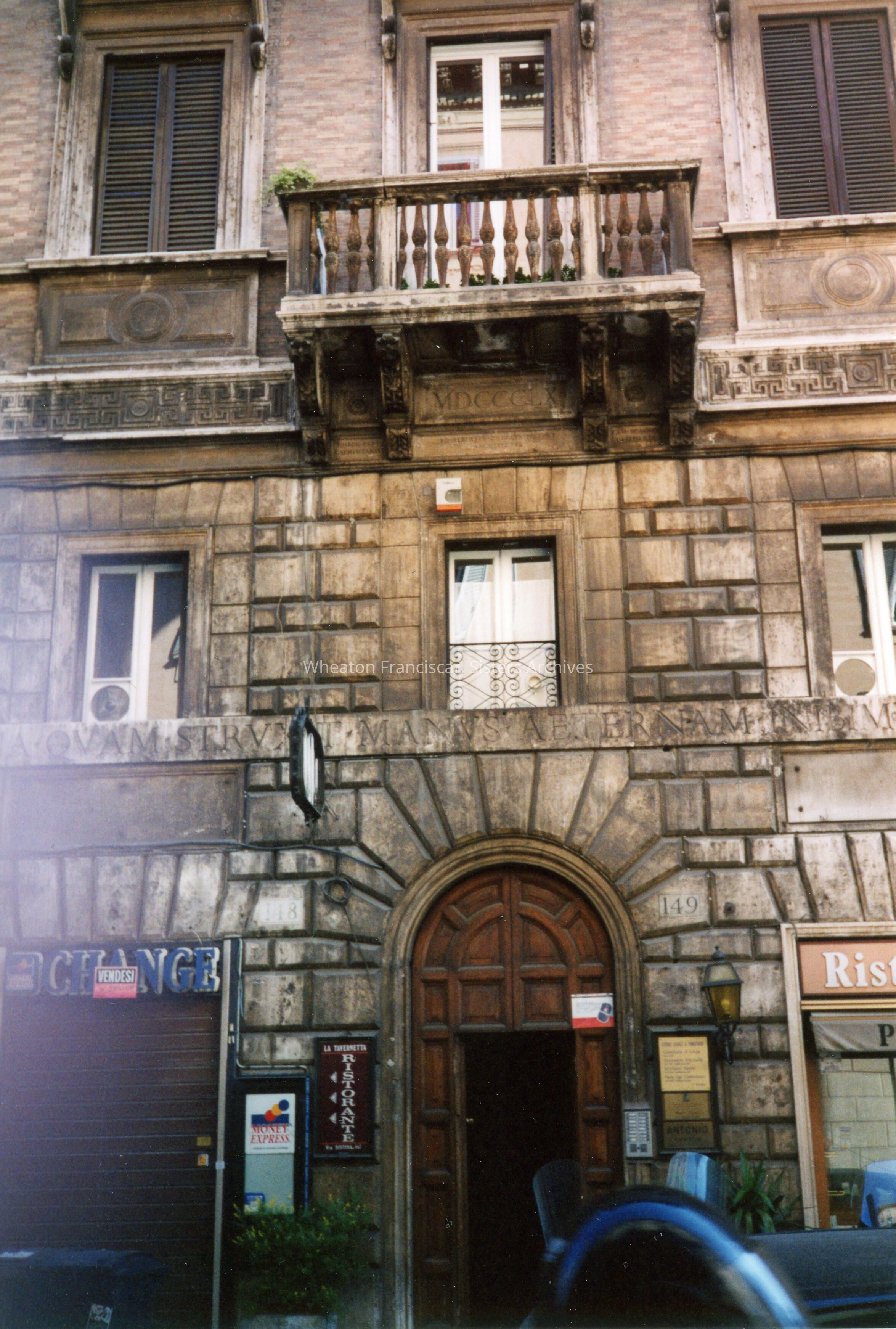 The entrance and third floor balcony at 149 Via Sistina in Rome, Italy. Mother Clara Pfaender arrived in Rome in February of 1881 and this location was her final residence. She passed away here on October 5th, 1882. The Roman Numerals under the balcony represent the year 1860. An inscription on the building reads "When in short time we leave this house / that others' hands have built for us, / we shall enter an everlasting house / that we have built with our own hands".