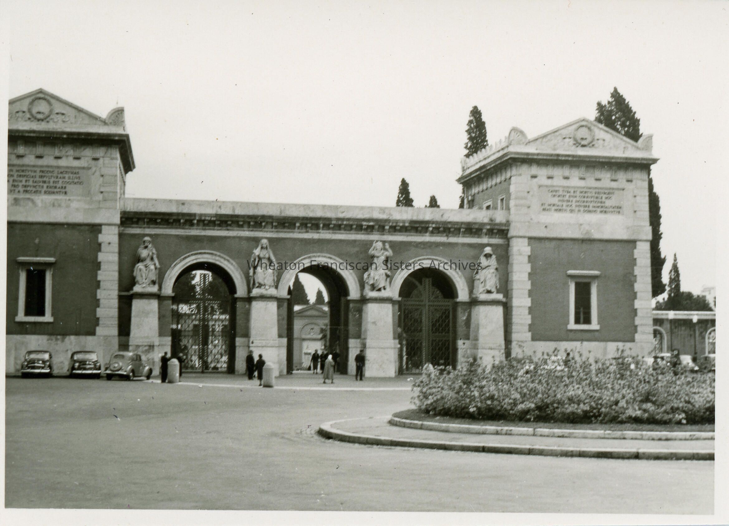 The entrance to St. Lorenzo Cemetery, located next to the Basilica of St. Lorenzo, in Rome, Italy. Mother Clara Pfaender, foundress of the Franciscan Sisters, Daughters of the Sacred Hearts of Jesus and Mary, is buried here.Context