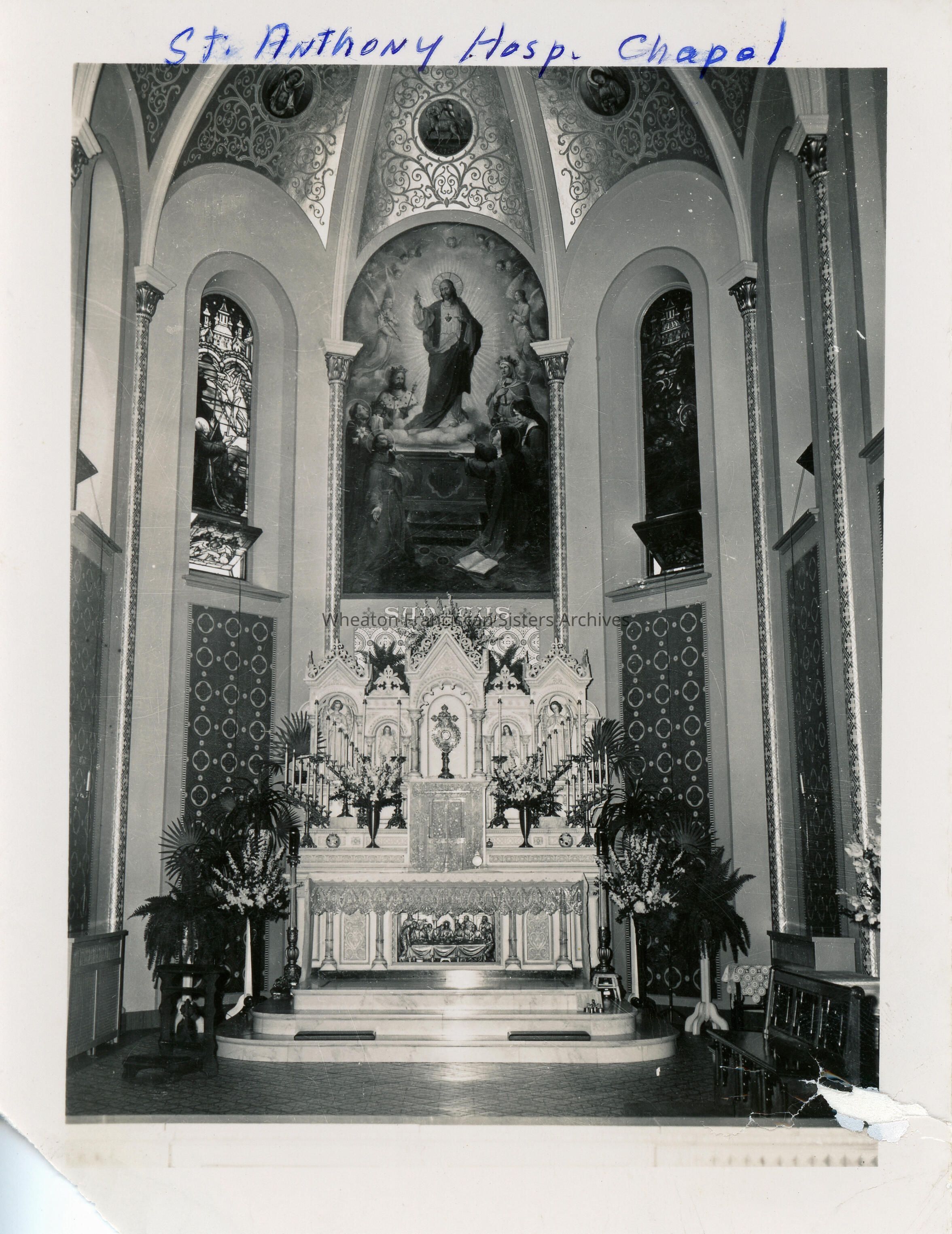 The chapel in St. Anthony’s Hospital located at 3520 Chippewa Street in St. Louis, Missouri. This image looks towards the altar.