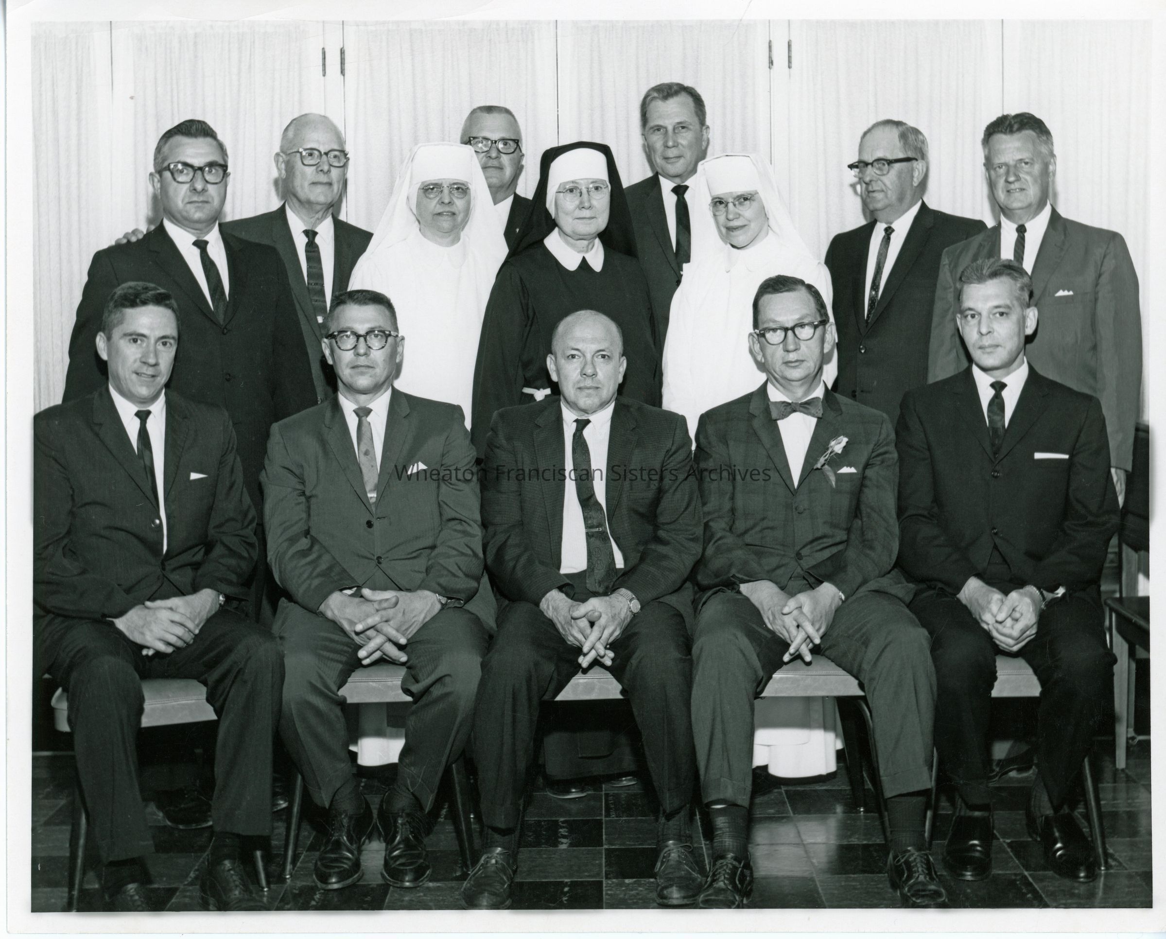 St. Francis Hospital at 825 Good Hope Street in Cape Girardeau, Missouri. From left to right are Sister Rosa (Valeria) Aubertin, Sister Elisabeth (Redempta) Lefarth and Sister Dorothy (Jeanne) Gengler. The men present are unidentified. Opened in 1914, this hospital replaced an older structure located at Sprigg and Williams Streets. St. Francis remained here until 1976 and the building was demolished in 2000. Affordable housing now occupies the site.