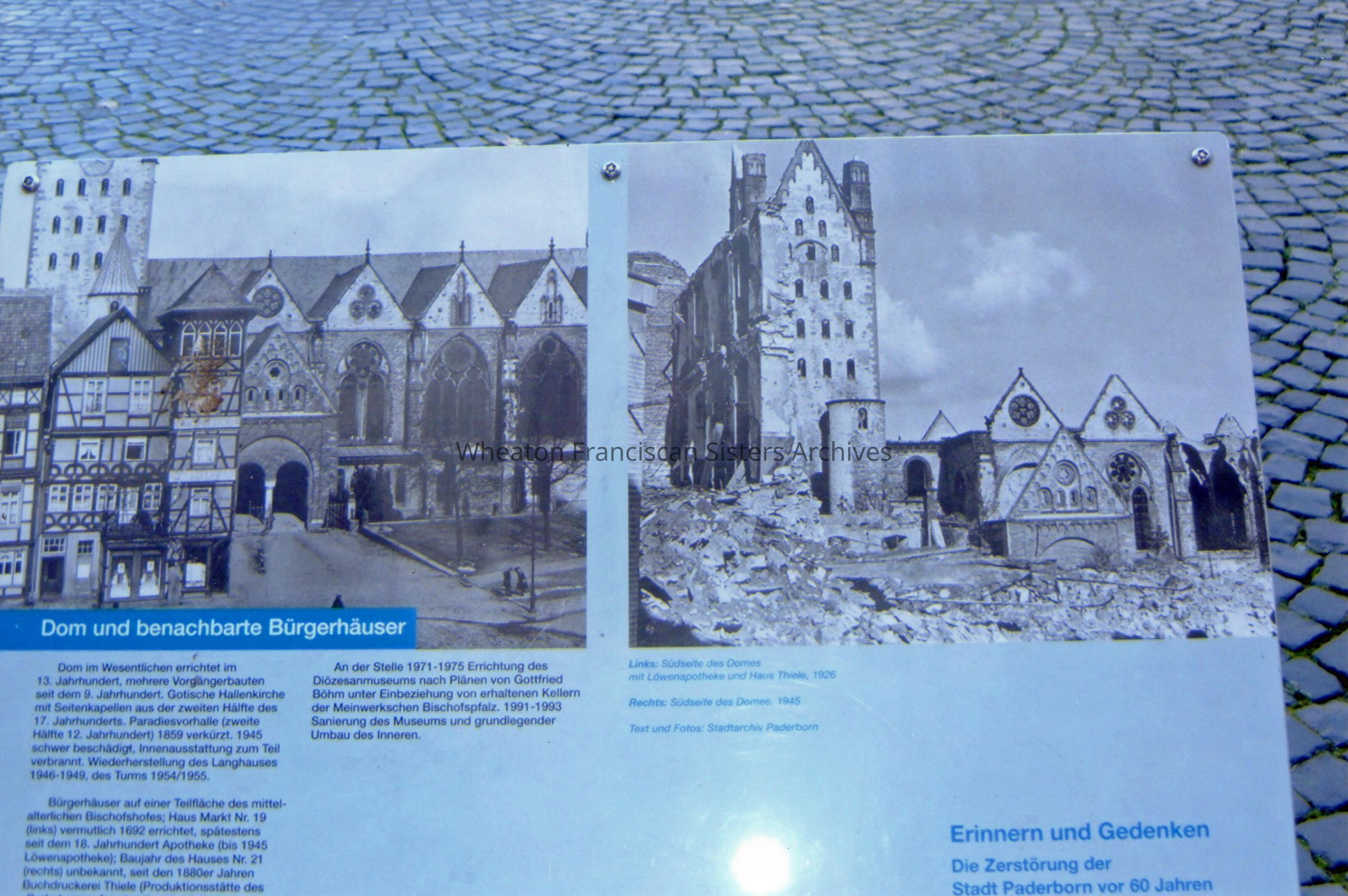 Historic marker for the cathedral in Paderborn, Germany. It features an image of the structure before World War II and after.