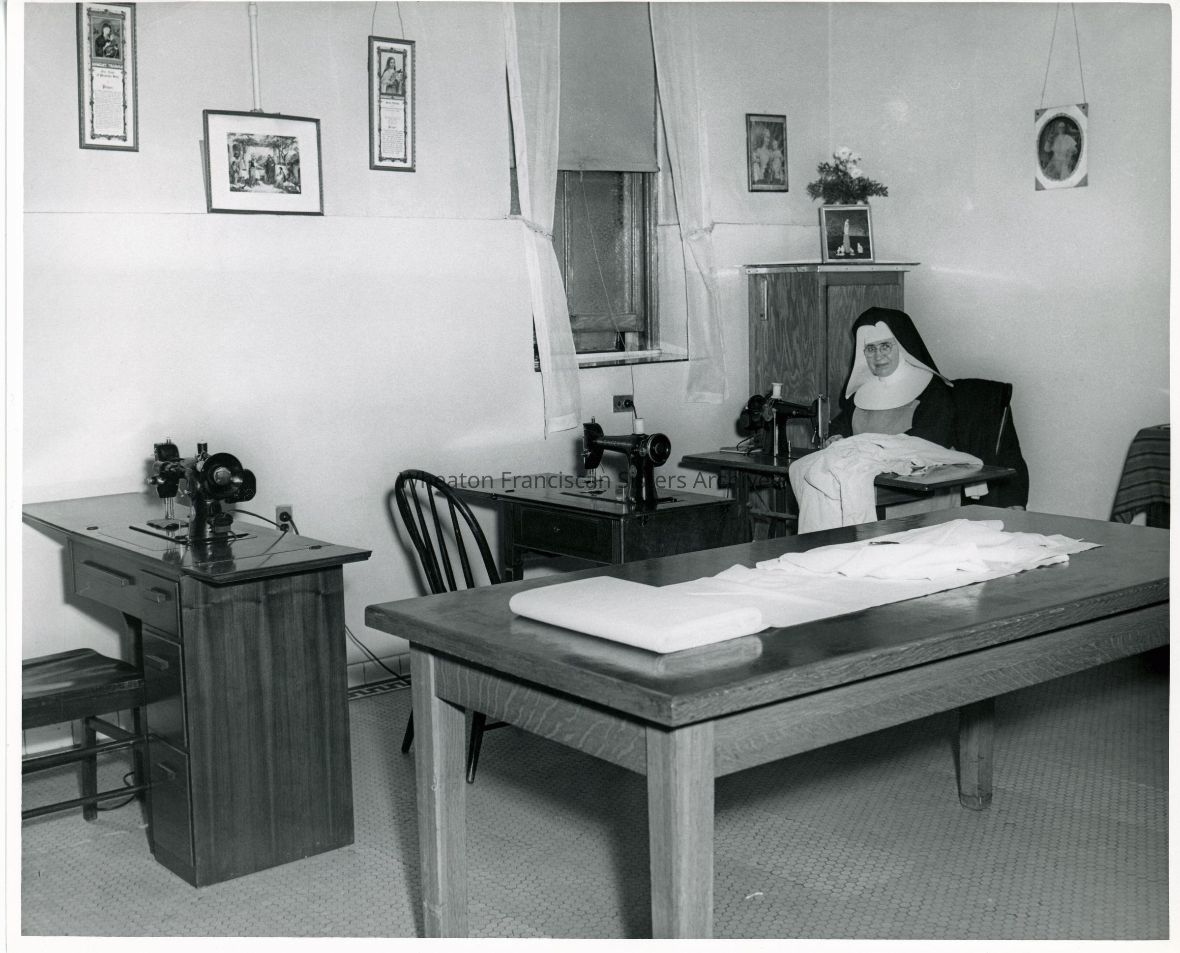 Sister Sister Feliciana (Annuntiata) Staffa at a sewing machine. This image may have been taken in either Cape Girardeau, Missouri or Murphysboro, Illinois.Context