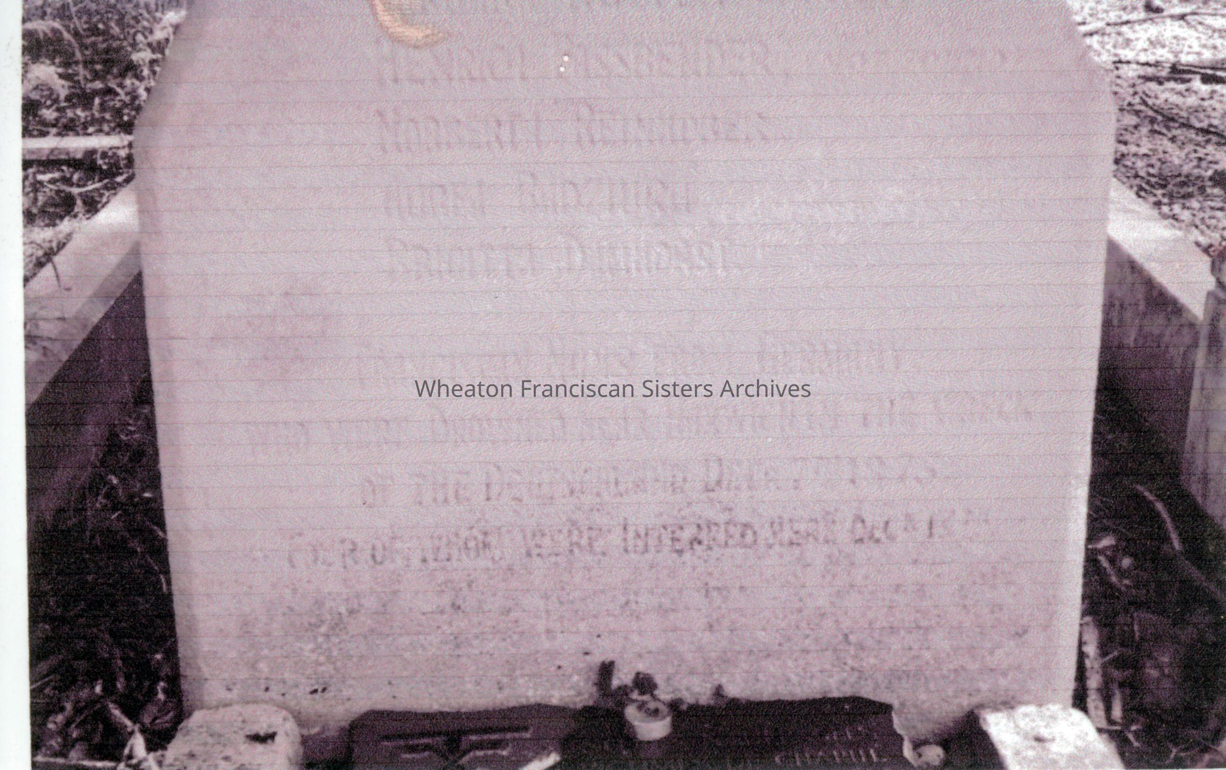 Gravesite for the Franciscan Sisters who perished on the S.S. Deutschland in December of 1875. It is located in St. Patrick's Cemetery in Leytonstone, England. This image was taken just prior to a restoration. The ship sank after it ran aground off Harwich during a heavy winter storm. Although five sisters were on the vessel, the body of Sister Henrica (Catherine) Fassbender was never recovered. The four Sisters buried at this site are Sister Barbara (Thekla) Hültenschmidt, Sister Brigitta (Elisabeth) Damhorst, Sister Norberta (Johanna) Reinkober and Sister Aurea (Josepha) Badziura. The women were traveling from the motherhouse in Salzkotten, Germany to St. Louis to lead the new American mission.Context